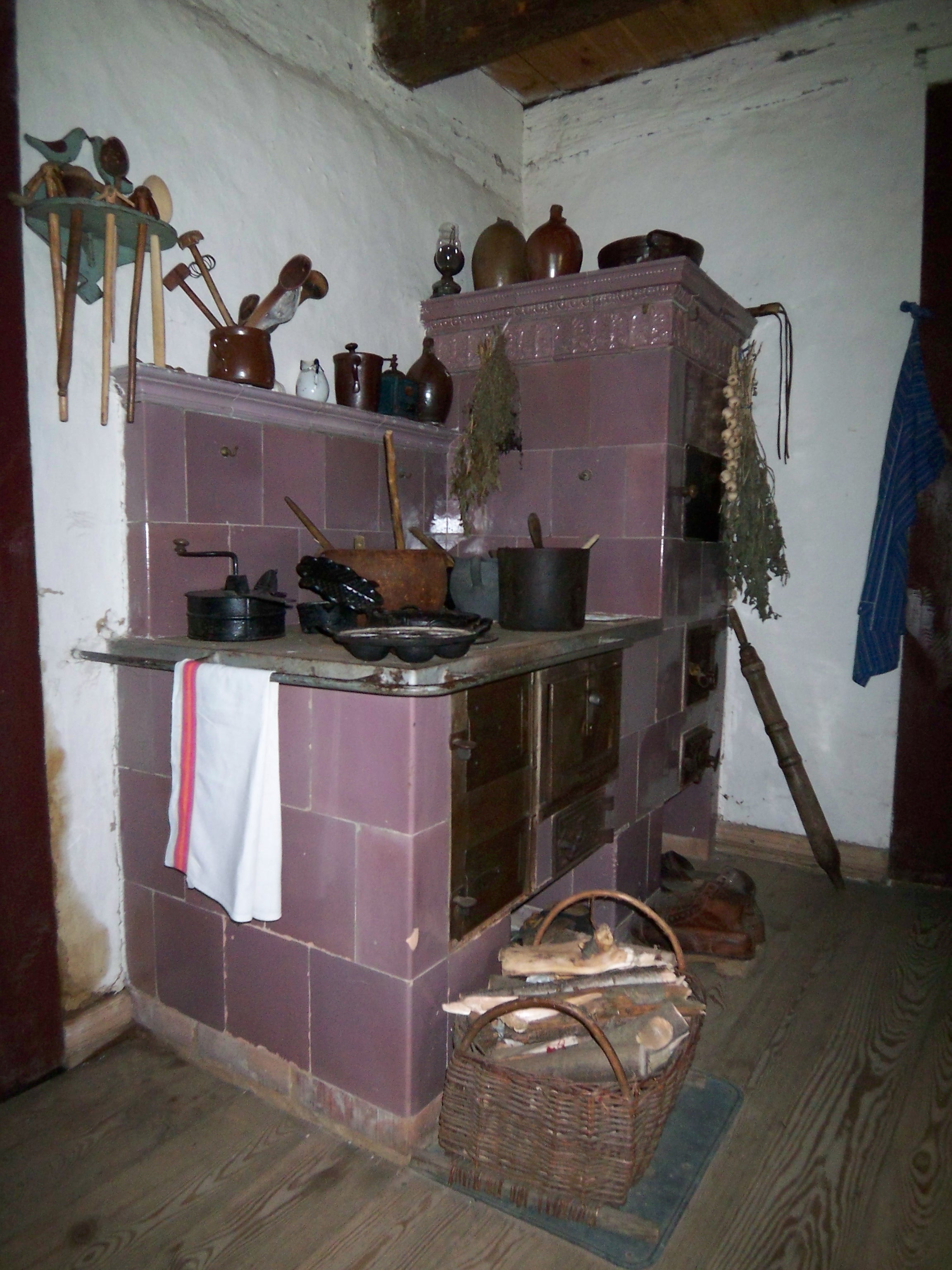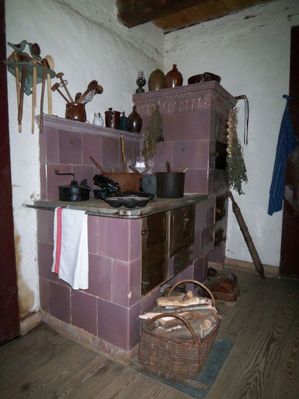 Kuchnia kaflowa o palenisku zamkniętym pod płytą w karczmie ze wsi Solec Nowy. Na kuchni zestaw garnków oraz innych naczyń. Między innymi maszyna do wypiekania gofrów, urządzenie do parzenia kawy zbożowej, patelnia do jajek.