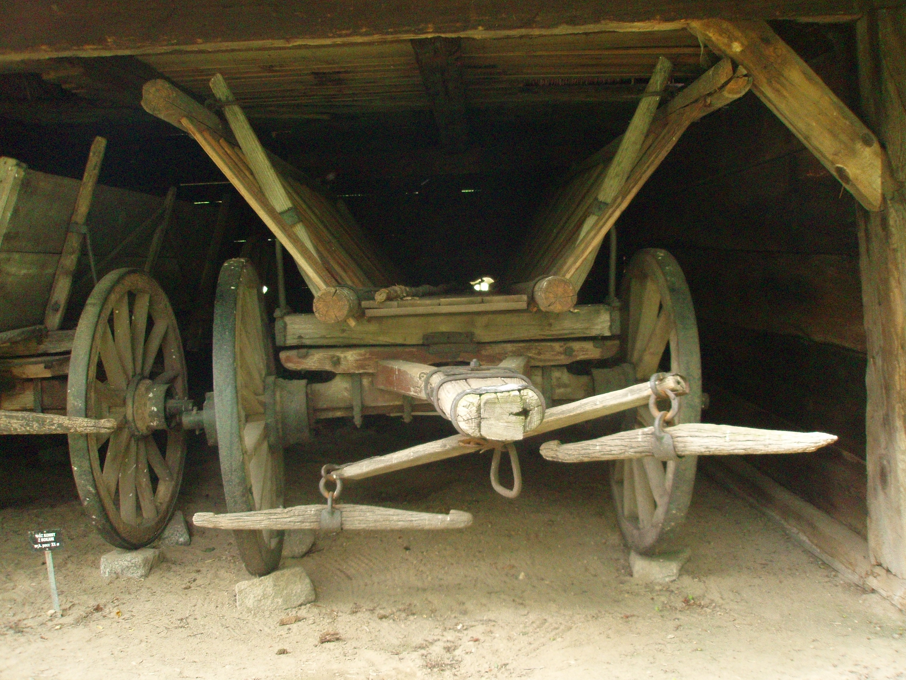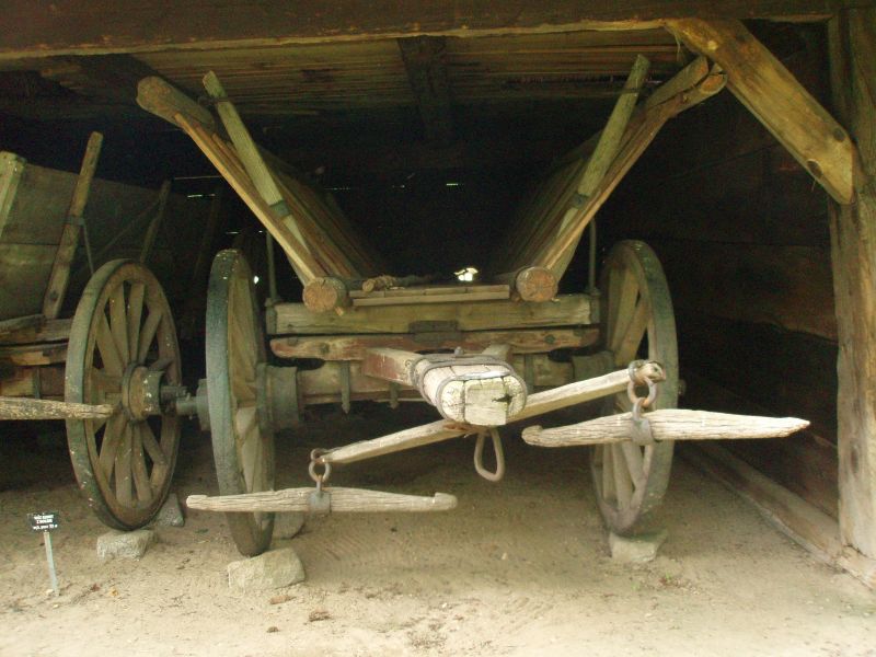 Wóz drabiniasty wewnątrz wozowni w zagrodzie karczmarza.