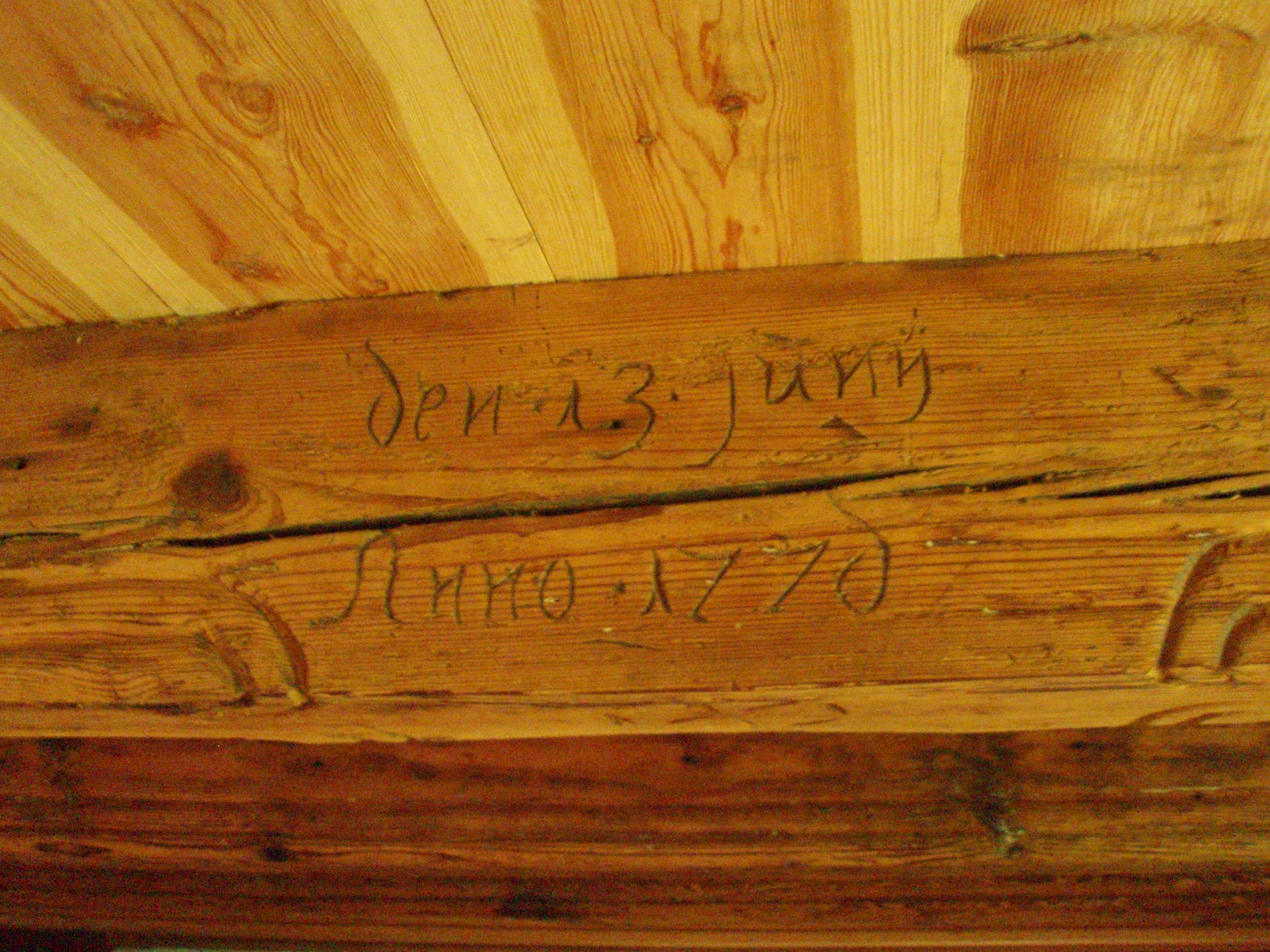 Belka stropowa w chałupie olędnerskiej z datą wzniesienia budynku 13 lipca 1770 rok.