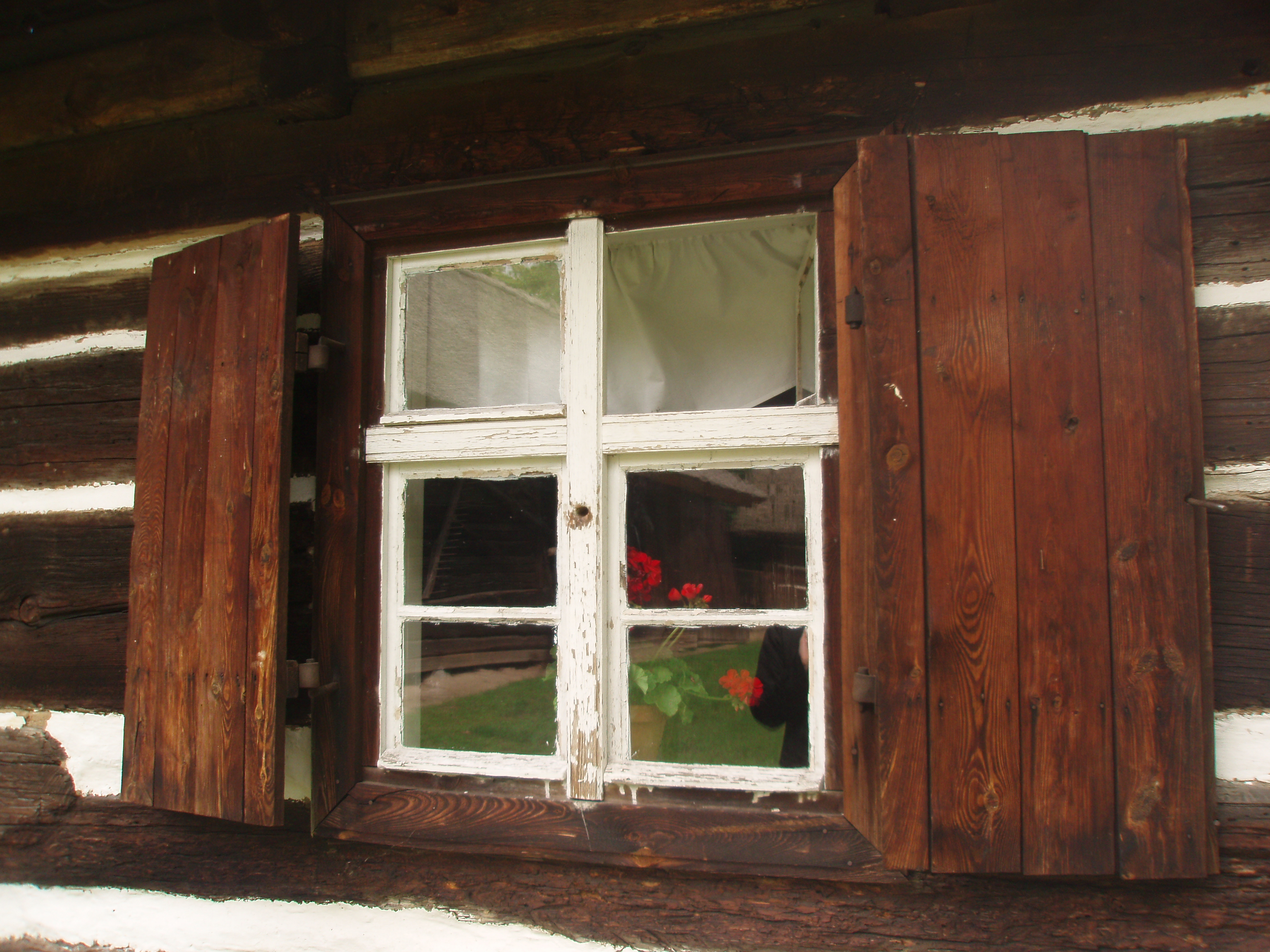Okno karczmy ze wsi Solec Nowy z 1706 roku. Okno z drewnianymi okiennicami. Budynek o konstrukcji zrębowej z wypełnieniami zrębu malowanymi wapnem na biało.