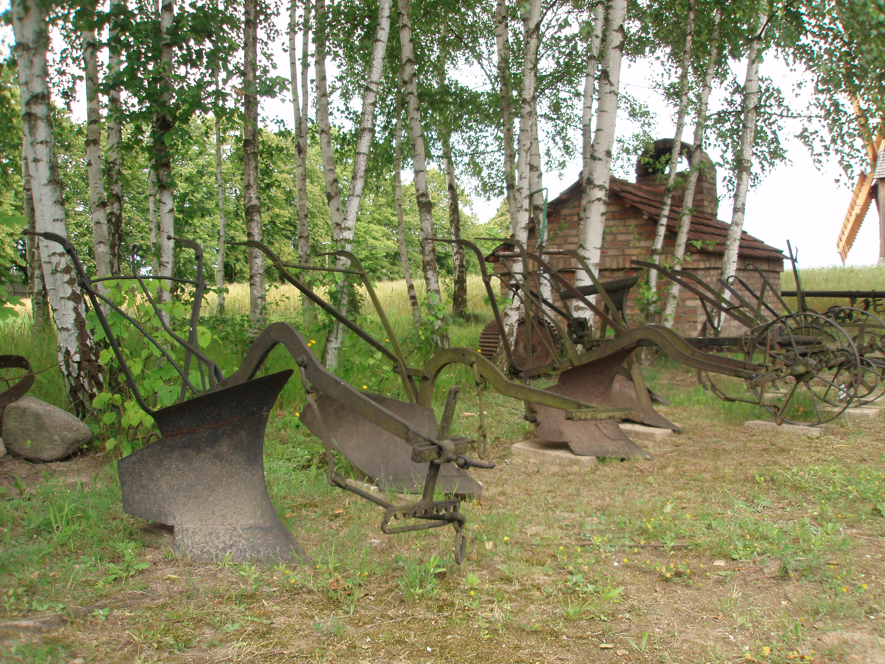 W parku maszyn wystawione są siewniki, snopowiązałki, pługi, radła, brony i kieraty.