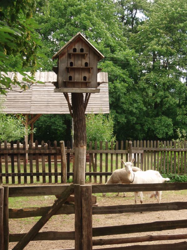 Drewniany gołębnik na planie prostokąta umieszczony na słupie. Hodowle gołębi były popularne na tych terenach. Z ich mięsa robiono delikatny rosół.
