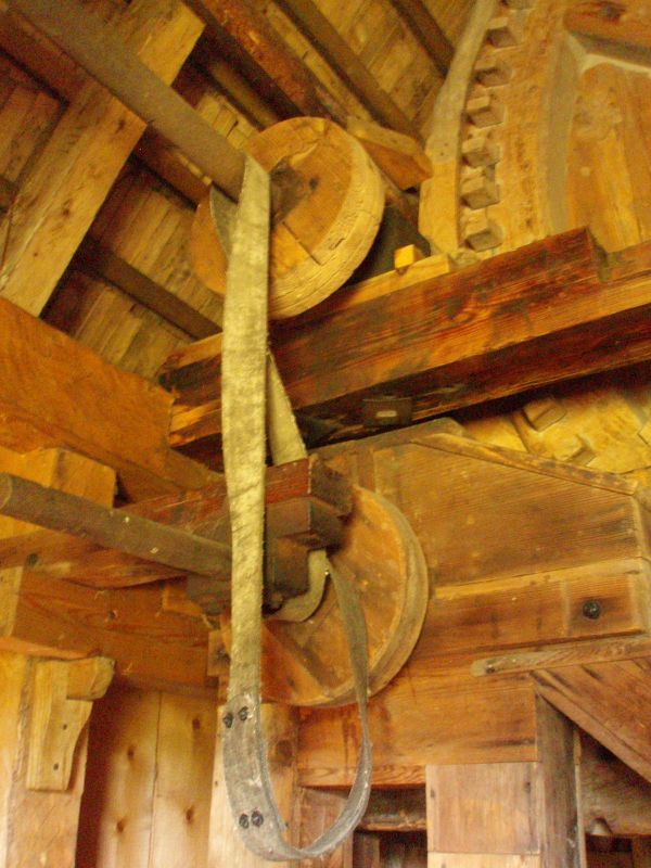 Mechanizm wiatraka typu koźlak ze wsi Sława Sląska z 1603 roku. Precyzyjnie zbudowany system przekładni i kół pozwalał młynarzowi mielić do 2 ton zboża dziennie.