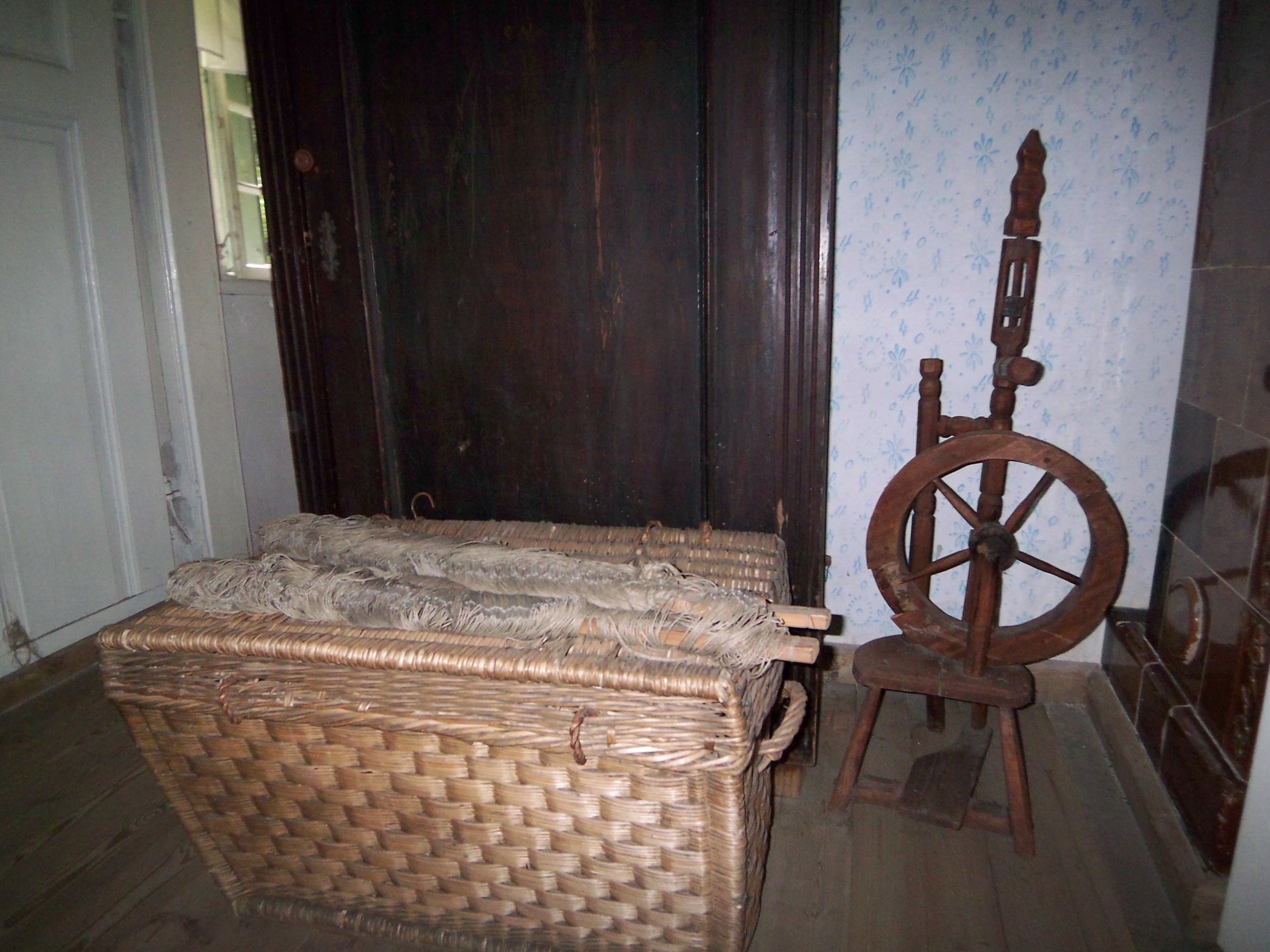 Wnętrze chałupy w zagrodzie ze wsi Reklinek z II połowy XIX wieku. Na zdjęciu widoczna drewniana szafa, pleciony kosz wiklinowy i fragment kaflowego pieca grzewczego.
