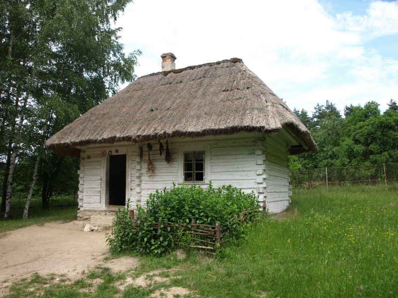Chałupa ze wsi Płaza z końca XIX wieku. Architektura charakterystyczna dla biedoty wiejskiej. Budynek jednoizbowy o konstrukcji zrębowej z węgłami łączonymi na "obłap". Ściany pobielone wapnem. Fundament z kamienia. Dach czterospadowy kryty gładko słomą. Przed chałupą niewielki ogródek.