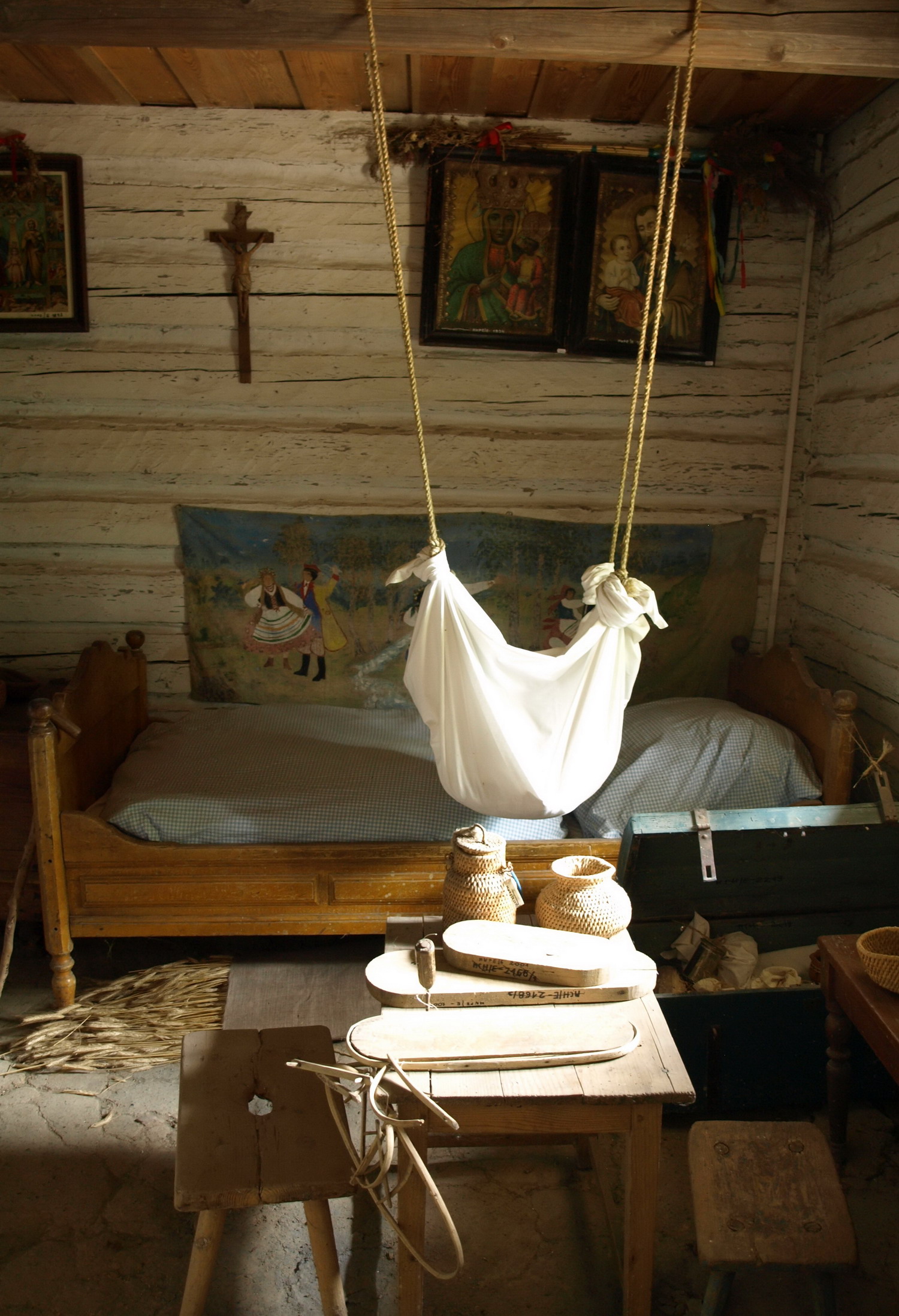 Wnętrze chałupy ze wsi Płaza z końca XIX wieku. Chałupa jednoizbowa. Na zdjęciu widoczne drewniane łóżko, płócienna kołyska zawieszona pod sufitem, krucyfiks i święte obrazy na ścianie, oraz ludowa makatka. Podłoga z polepy glinianej.