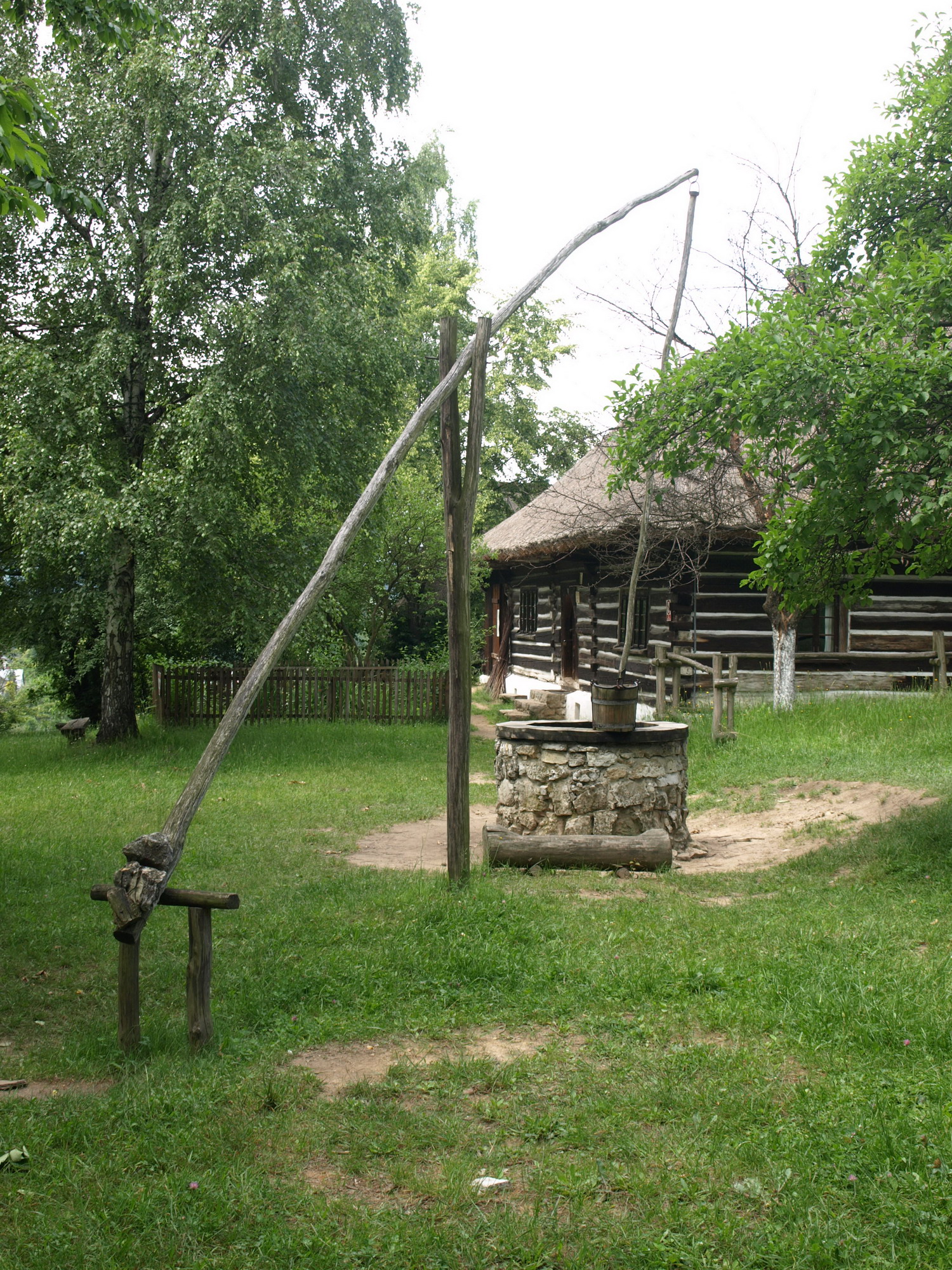 Studnia z żurawiem. Studnia o cembrowinie z kamienia. Za nią chałupa ze wsi Przeciszów z 1837 roku należąca do bogatego chłopstwa. Chałupa o konstrukcji zrębowej z pobielonym wypełnieniem zrębu. Dach czterospadowy kryty słomianą strzechą.