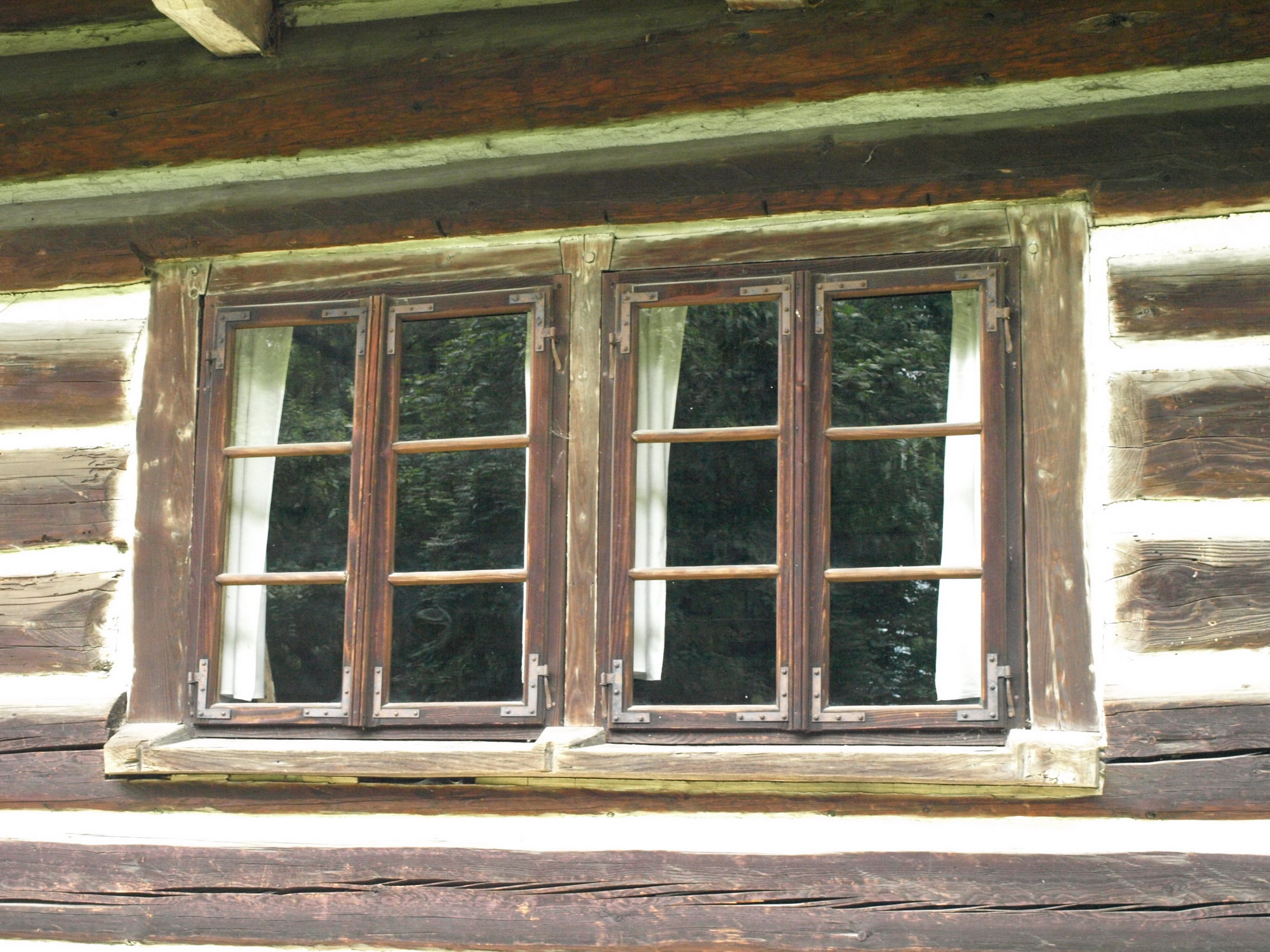 Okna części mieszkalnej zagrody ze wsi Rozkochów z 1813 roku. Okna dwuskrzydłowe. Budynek o konstrukcji zrębowej. Wypełnienie zrębu pobielone.