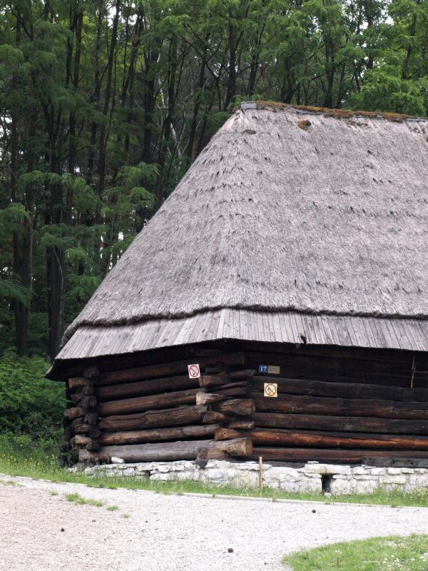 Fragment plebańskiej stodoły ośmiobocznej ze wsi Regulice z II połowy XIX wieku. Budynek o konstrukcji zrębowej z węglami łączonymi na "obłap". Fundament z kamienia. Dach ośmiospadowy kryty trzciną, a w najniższej partii (okap) gontem.