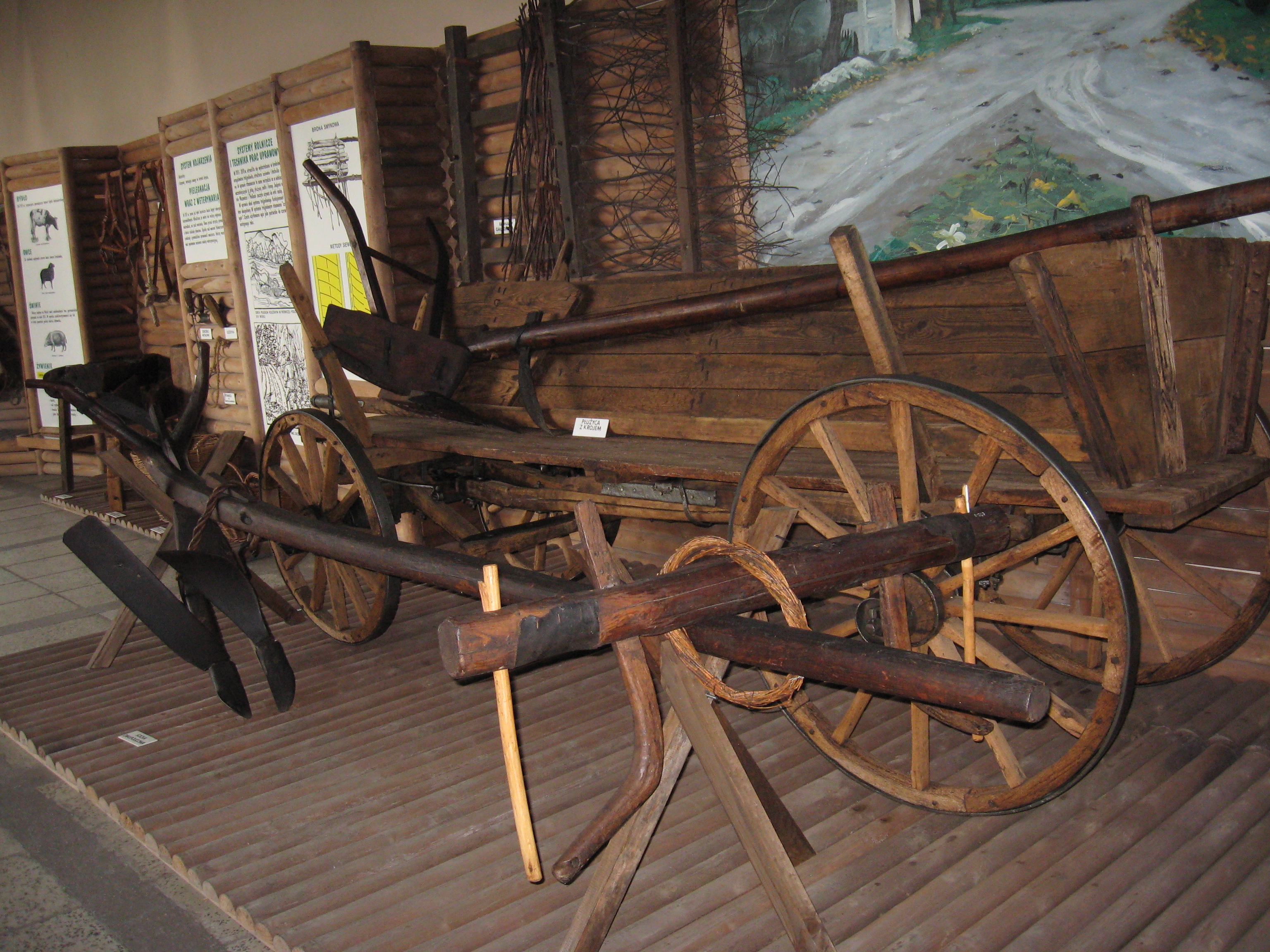 Socha dwupolicowa, płużyca z krojem i wóz drewniany.