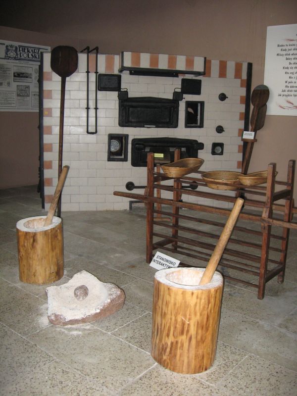 Stanowisko interaktywne w Szreniawie. Na zdjęciu widoczne stępy ręczne do produkowania kaszy. Stępy z drążonej kłody.