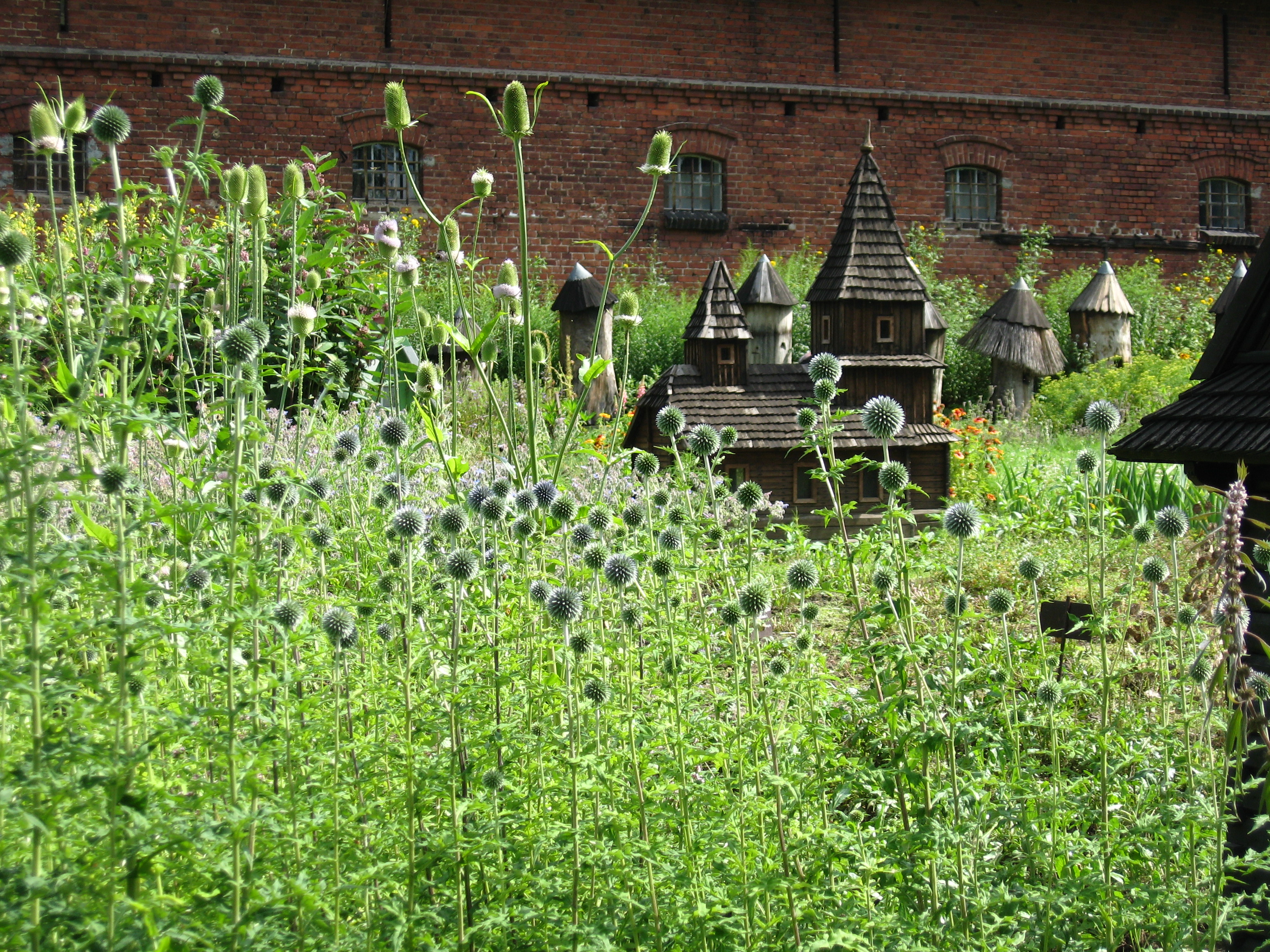Widok na ul architektoniczny o kształcie kościoła i stojaki rozmieszczone w ogrodzie skansenu.