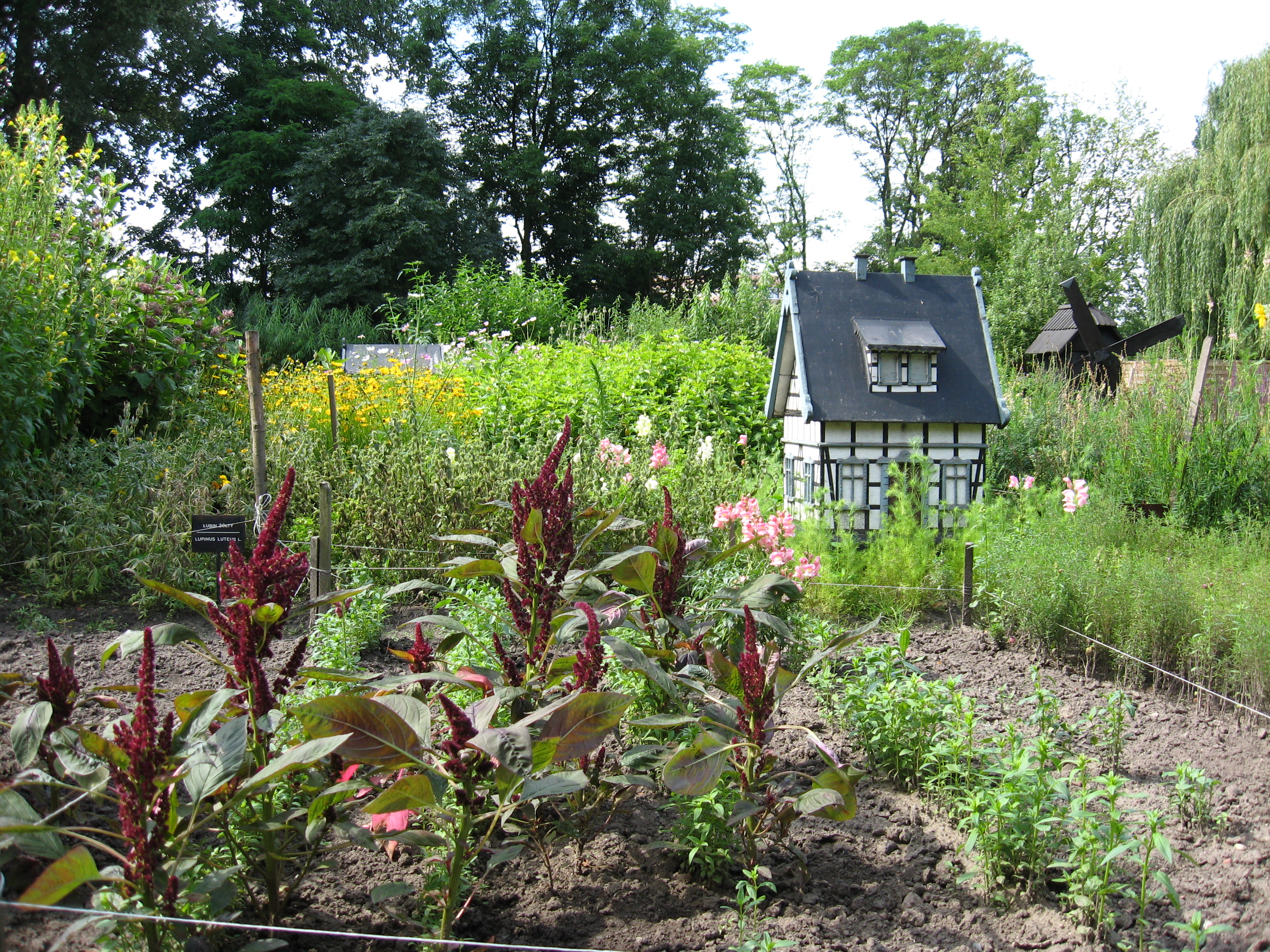 Widok na ul architektoniczny w ogrodzie skansenu.