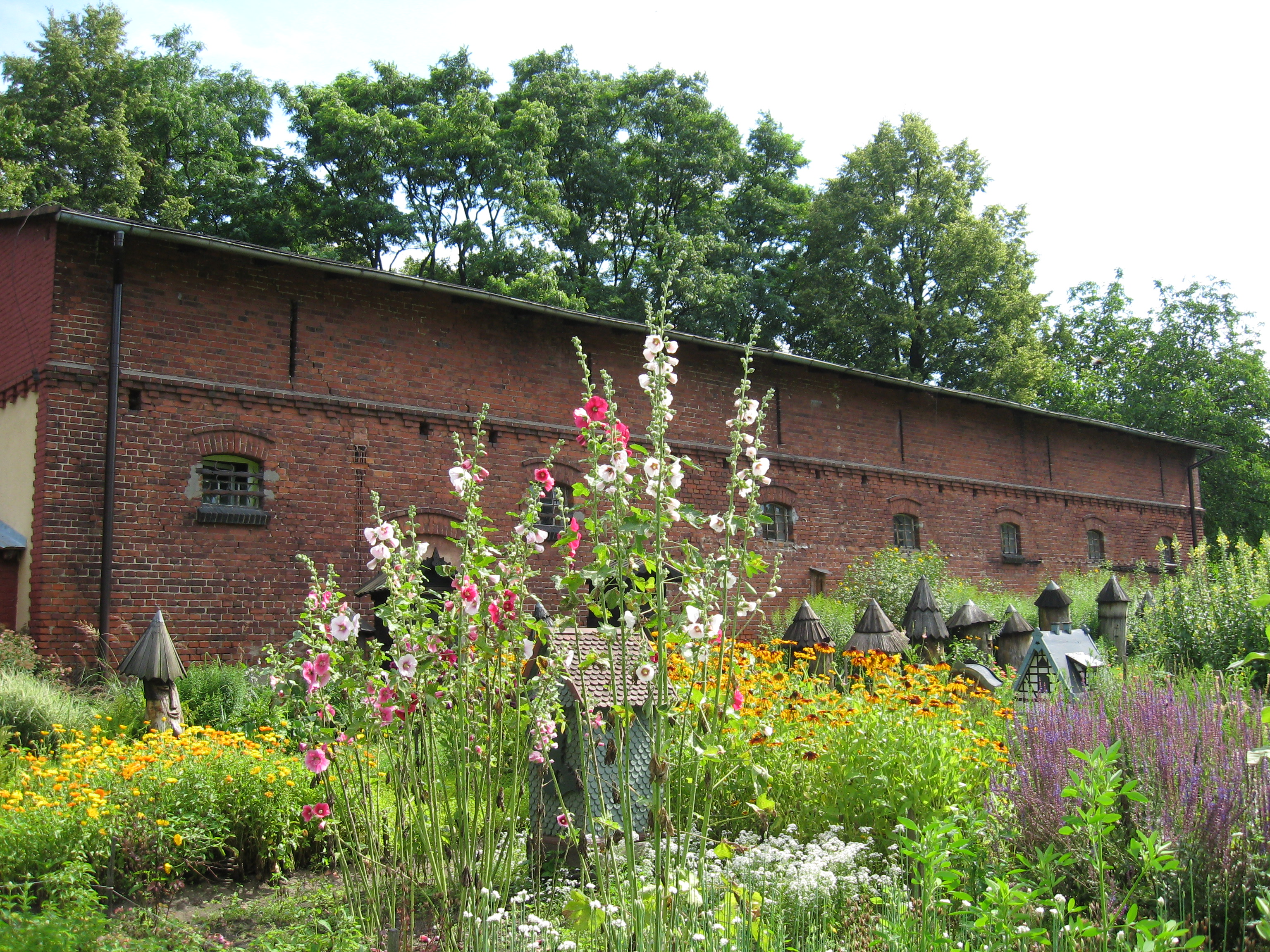 Widok na ogród kwiatowy, pasiekę i budynek muzeum w miejscowości Swarzędz.