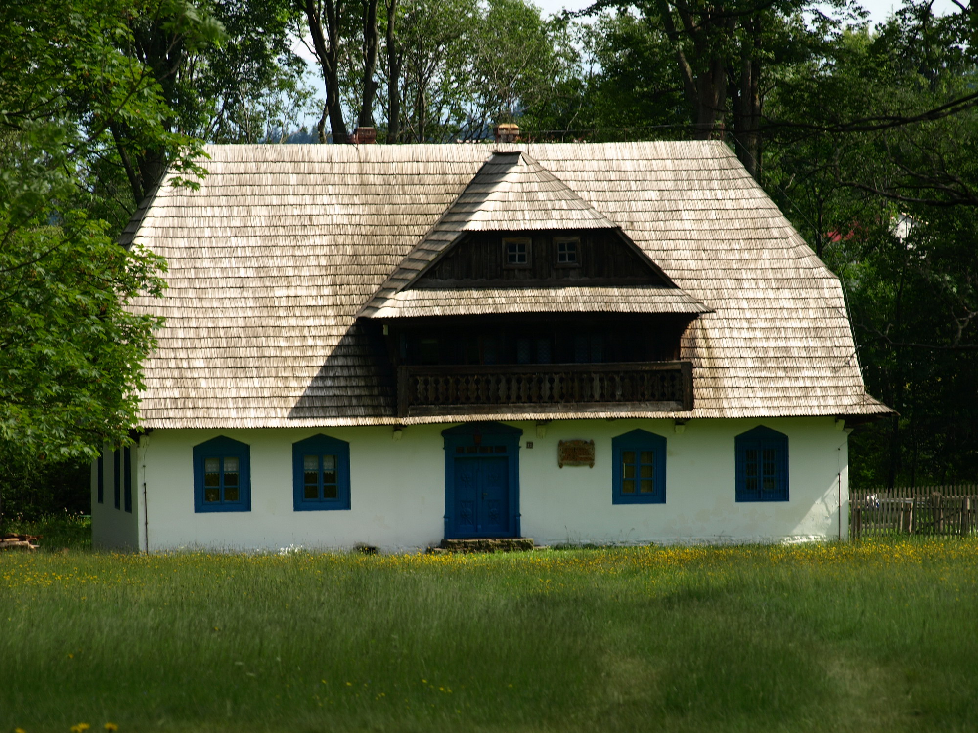Biała Karczma ze wsi Podwilk z 1885 roku. Budynek szerokofrontowy o konstrukcji zrębowej z otynkowanymi ścianami. Dach naczółkowy kryty gontem. Od frontu balkon nakryty daszkiem. Okna i drzwi ze zdobieniami pomalowane na niebiesko.