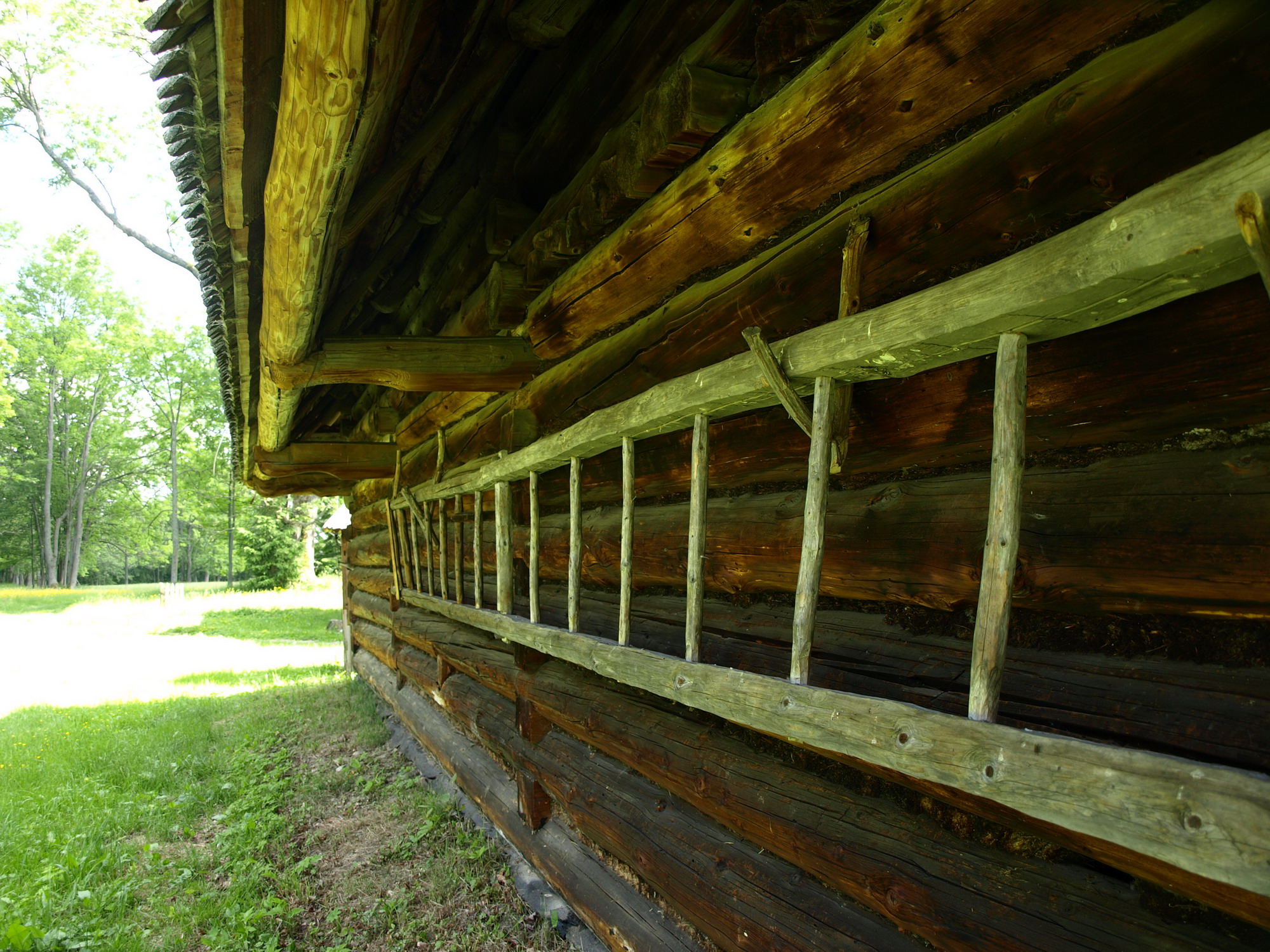 Drabina zawieszona na ścianie stajni w sołtysiej zagrodzie Moniaków. Budynek o konstrukcji zrębowej. Między belkami zrębu widać uszczelnienie mchem (mszenie).