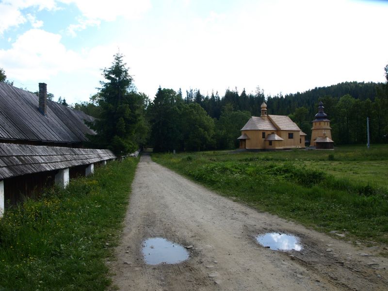 Droga oddzielająca starą część muzeum (otoczoną ogrodzeniem) i nową. Prowadzi tędy szlak turystyczny z Zubrzycy na przełęcz Krowiarki. Widać kościół Matki Boskiej Śnieżnej z I połowy XVIII wieku.