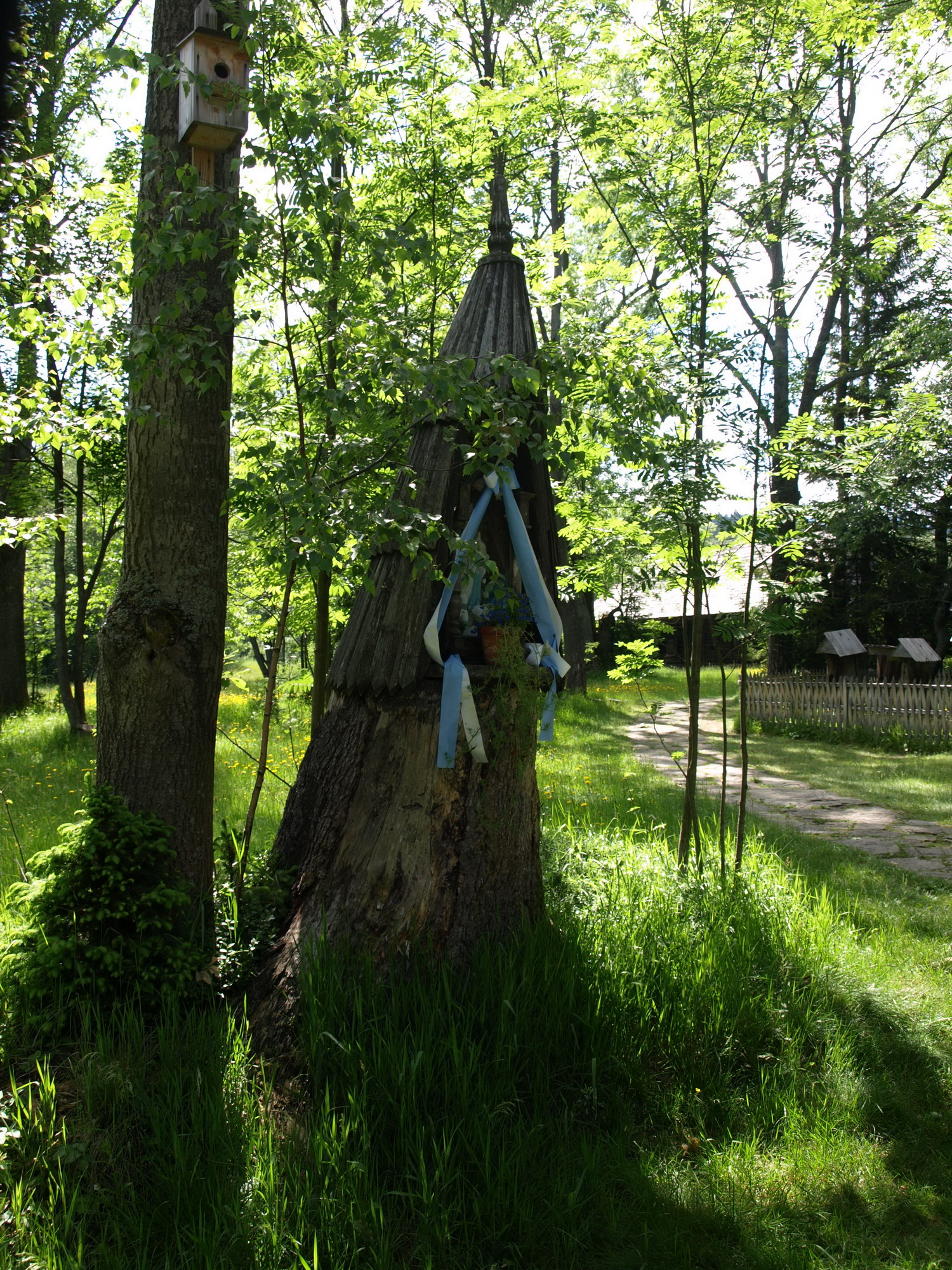 Kapliczka Najświętszej Marii Panny umieszczona na pniu ściętego drzewa. Kapliczka nakryta stożkowym daszkiem.