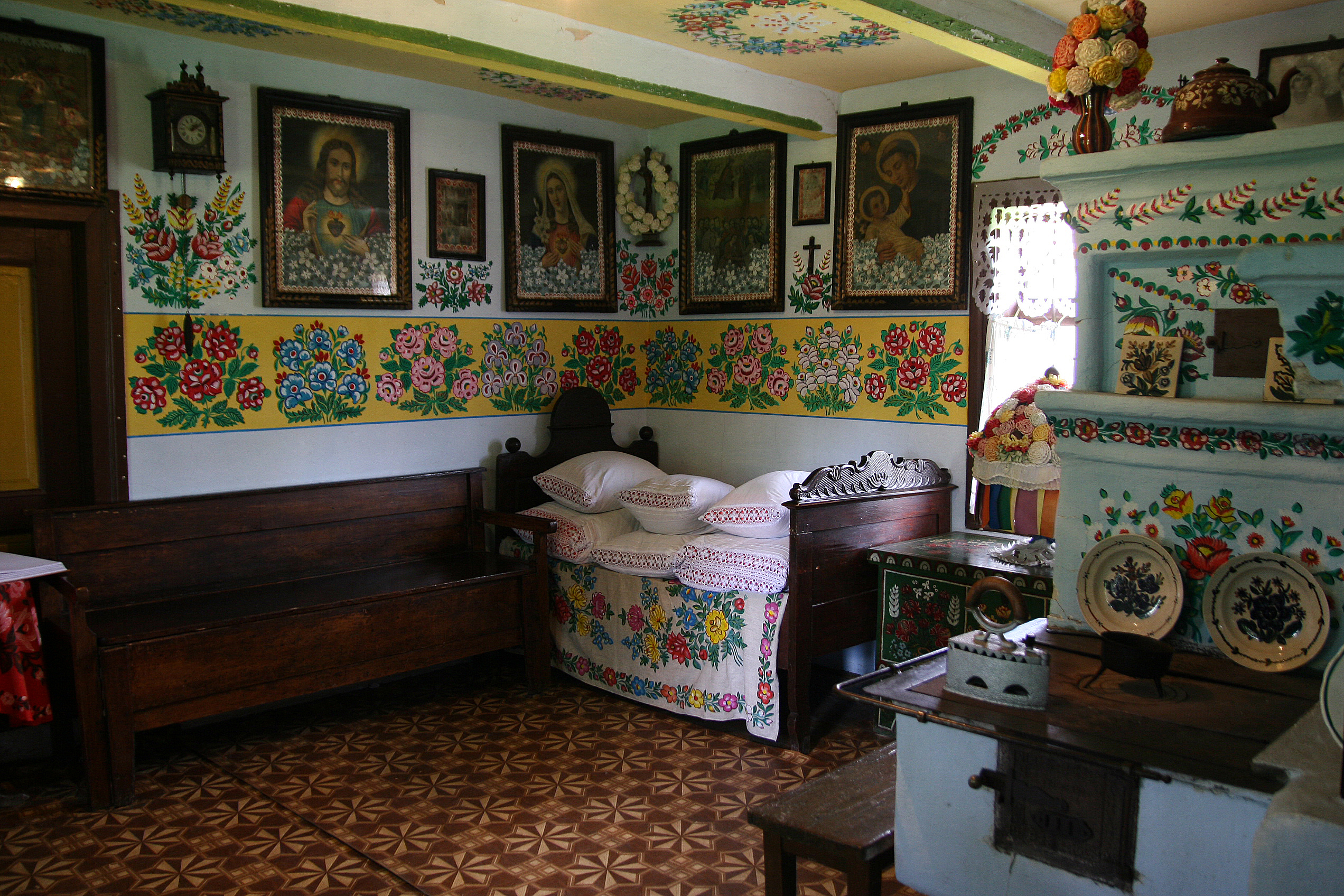 Izba czarna w chałupie Felicji Curyłowej. Kuchnia z paleniskiem zamkniętym pod płytą (typ angielski) i kapturem wspartym na pręcie. Drewniane łóżko i ława z oparciem. W rogu święte obrazy i krucyfiks. Zarówno piec kuchenny, jak i ściany oraz sufit bogato malowane we wzory kwiatowe. Na łóżku narzuta z wyszywanymi wzorami kwiatowymi. W oknie firanka z papieru. Na piecu i oknie stoją kwiaty z bibuły.