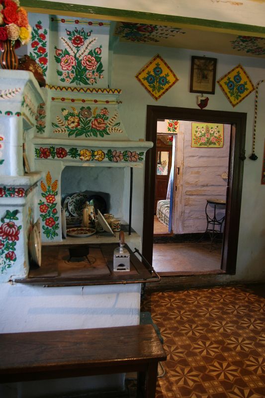 Kuchnia z paleniskiem zamkniętym pod płytą (typ angielski) i kapturem wspartym na pręcie w chałupie Felicji Curyłowej. Kuchnia bogato malowana w zalipiańskie wzory kwiatowe.