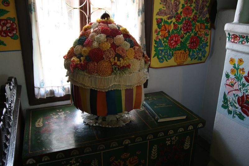 Rózga weselna z bibuły na bogato malowanej skrzyni wiannej w chałupie Felicji Curyłowej.