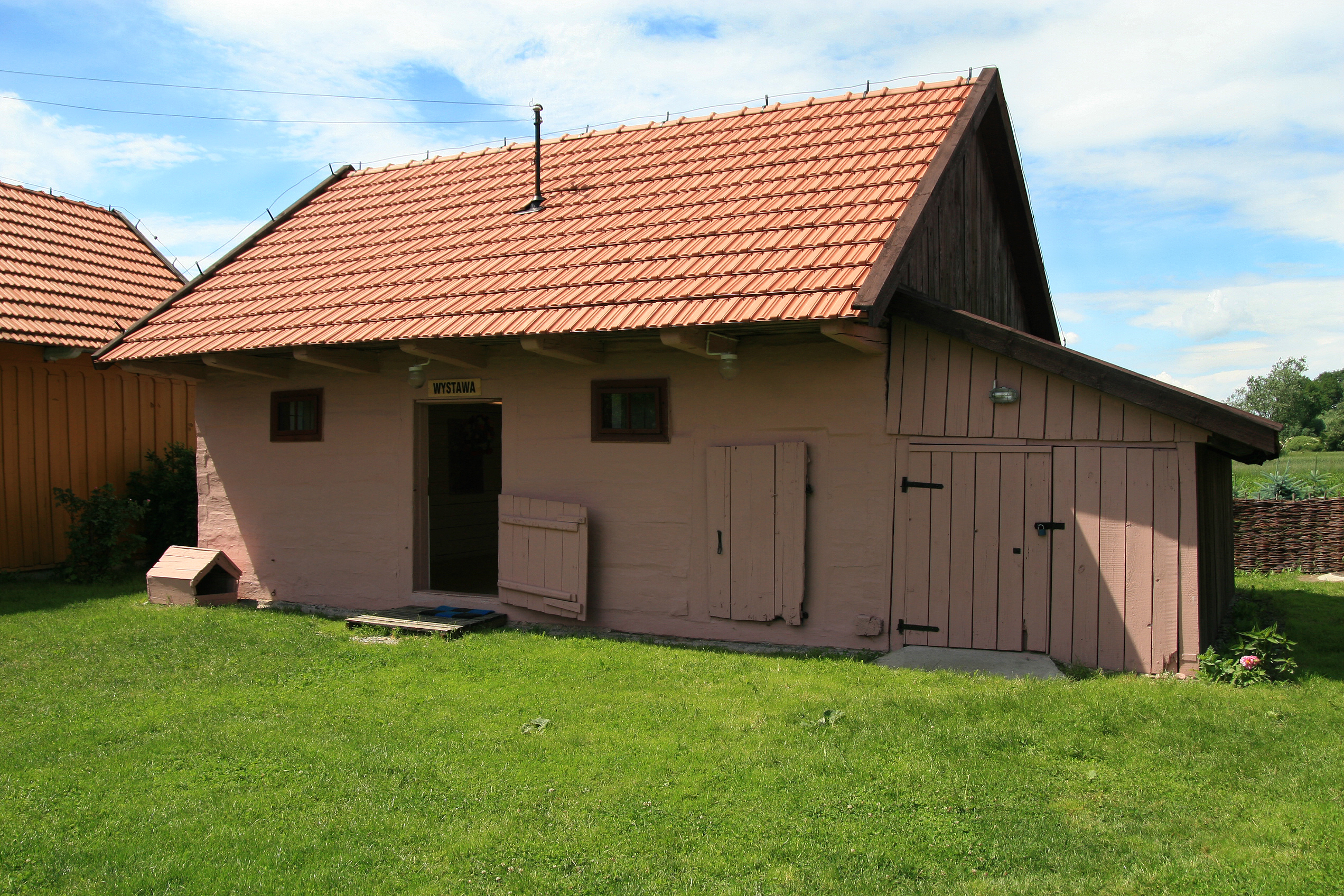 Zagroda Felicji Curyłowej. Budynek inwentarski mieszczący w sobie oborę, chlew i drewutnię. Budynek przygotowany pod odtworzenie zdobień Felicji Curyłowej - niebieskich wzorów kwiatowych. Budynek o konstrukcji zrębowej bez ostatków ze ścianami pomalowanymi na różowo. Dach dwuspadowy kryty dachówką. Drewutnia o konstrukcji słupowej obitej deskami dobudowana później. |