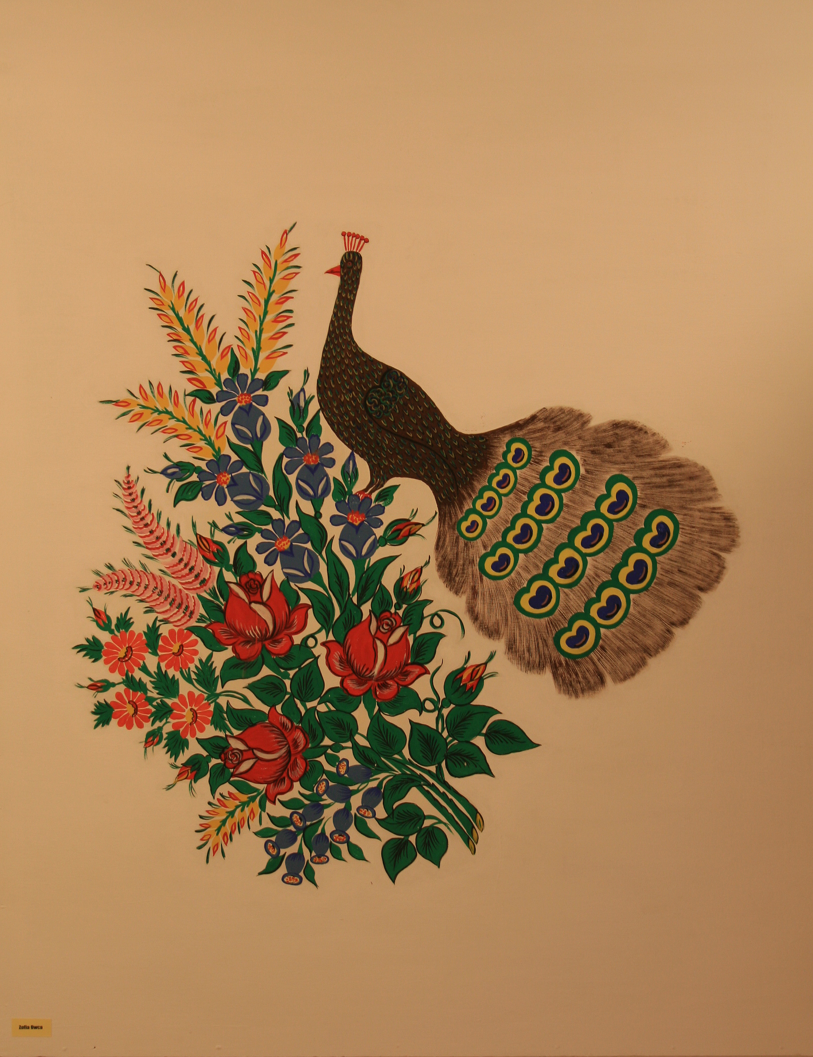 Malowanka Zofii Owcy w zagrodzie Felicji Curyłowej – oprócz kwiatów w zalipiańskim malowaniu pojawiają się też ptaki - tu paw.