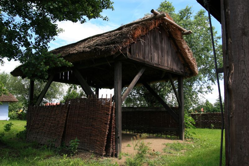 Bróg o konstrukcji słupowo-ryglowej z plecionymi, wiklinowymi ścianami i dachem dwuspadowym krytym strzechą.