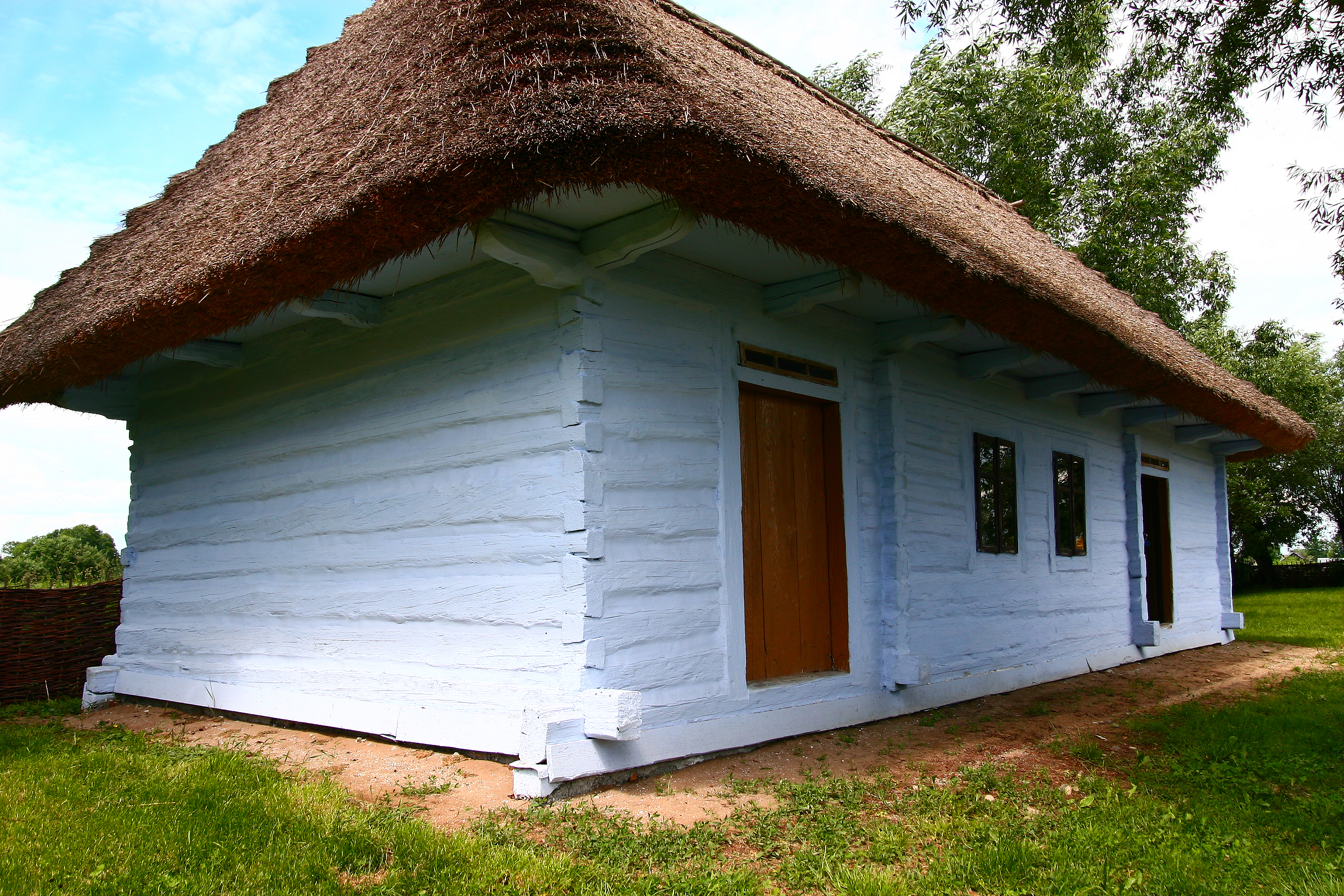 Chałupa biedniacka z końca XIX wieku przeniesiona do zagrody w 1981 roku. Budynek szerokofrontowy o konstrukcji zrębowej z węgłami łączonymi na "obłap" i ścianami pobielonymi wapnem. Dach czterospadowy kryty słomianą strzechą.