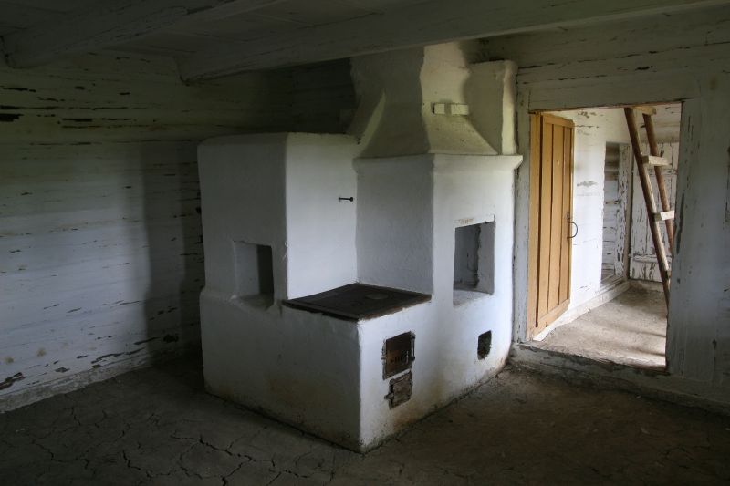 Kuchnia z piecem w izbie czarnej wewnątrz chałupy biedniackiej z XIX wieku. Kuchnia z paleniskiem zamkniętym pod płytą (typ angielski) i z kapturem. Podłoga z polepy glinianej.