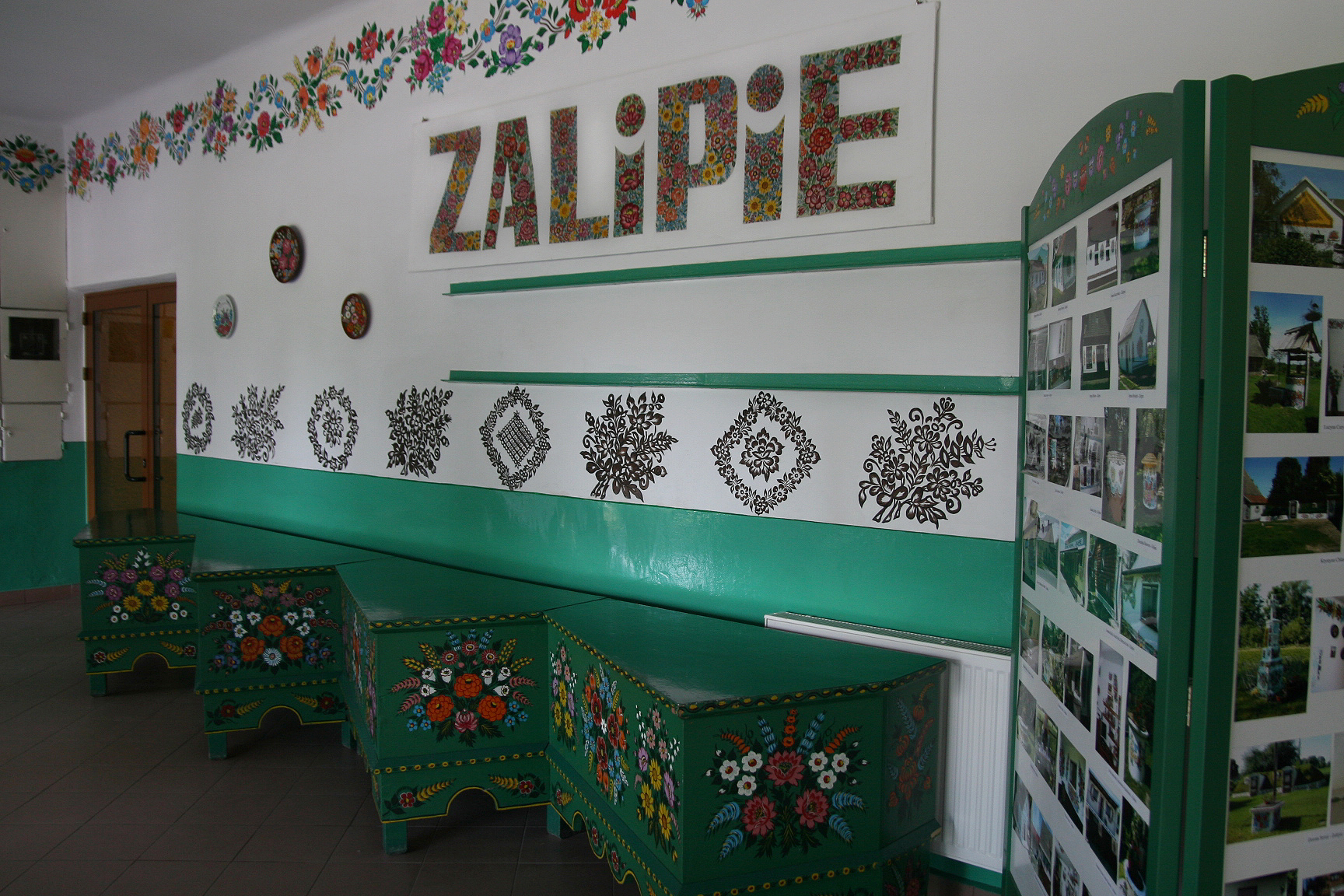 Wnętrze Domu Malarek z zalipiańskimi wzorami kwiatowymi na ścianach i drewnianymi ławami imitującymi zalipiańskie skrzynie wianne.
