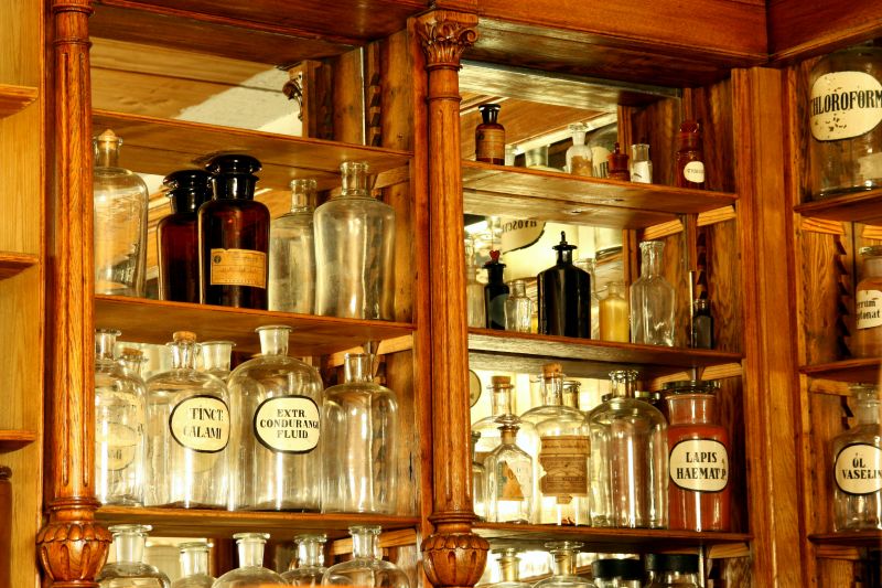 Aranżacja apteki z przełomu XIX i XX wieku. Meble apteczne z nieistniejącej już apteki ze wsi Busko-Zdrój. Na półkach kolekcja flakonów i słojów, w których przechowywane były leki.