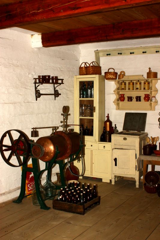 Ekspozycja sklepu z dwudziestolecia międzywojennego. Uwagę zwraca urządzenie do produkcji wody gazowanej i stojące przy nim skrzynki z oryginalnymi butelkami – oranżadówkami.