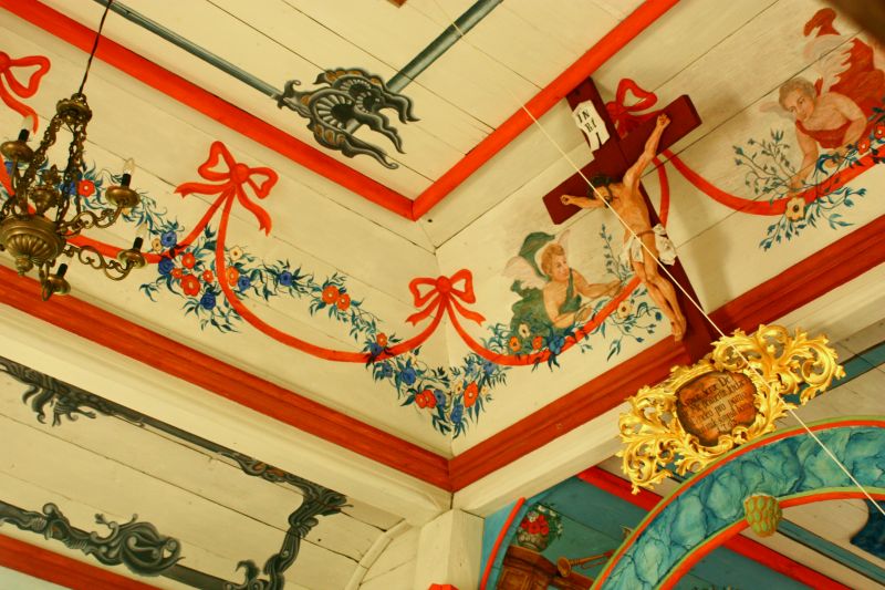 Wnętrze barokowego kościoła pod wezwaniem Matki Bożej Pocieszenia ze wsi Rogowo nad Wisłą z 1763 roku. Polichromowane pseudosklepienie. Zdobnictwo charakterystyczne dla małopolskiego baroku ludowego. Typowe dla regionu wstęgi, kokardy, girlandy roślinne w kościele z Rogowa.
