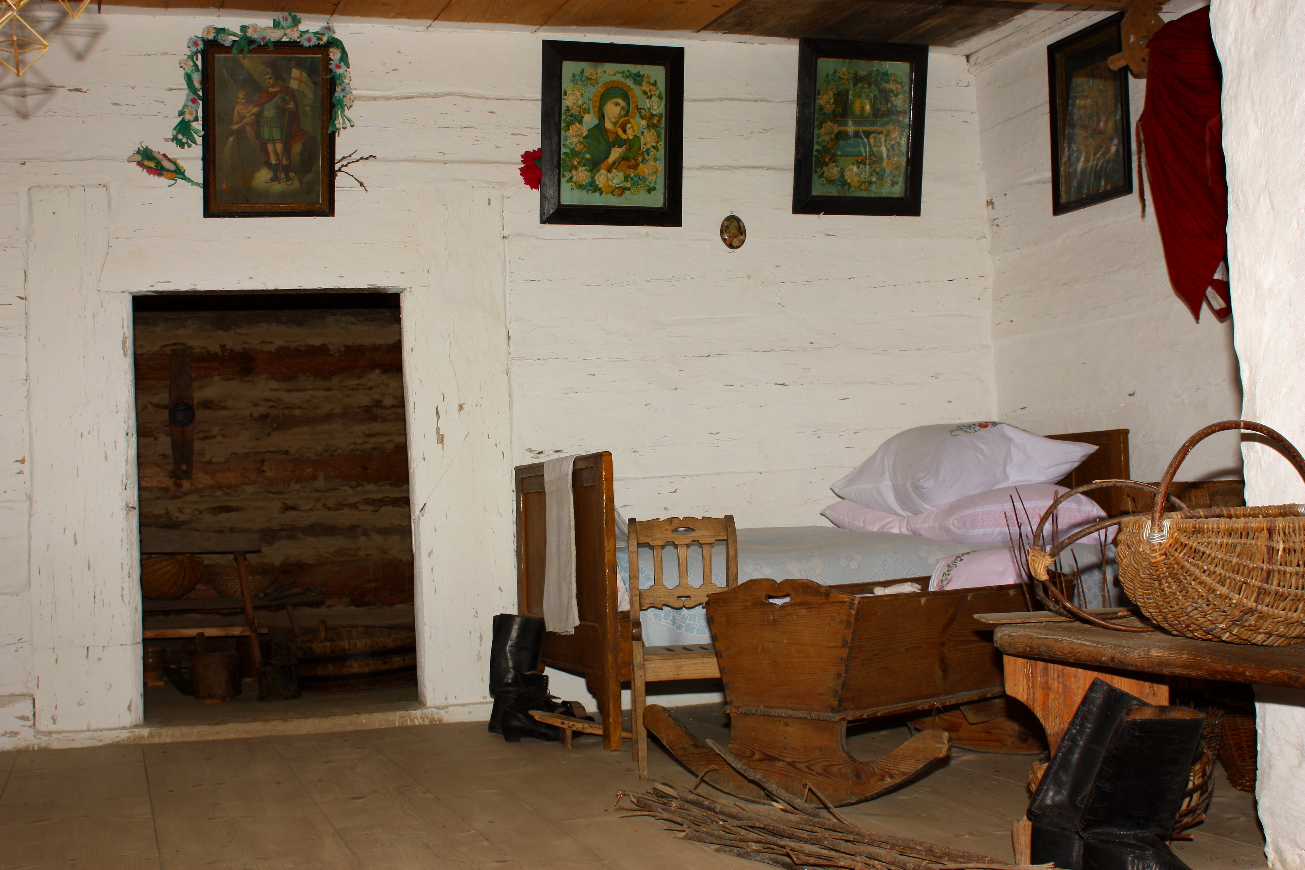 Wnętrze chałupy ze wsi Świątniki z 1758 roku. Izba czarna w mieszkaniu tkacza. Podłoga z desek.