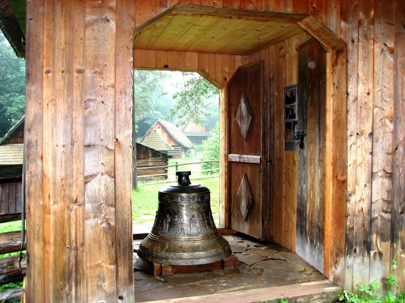 Zdobiony dzwon z cerkwi ze wsi Balnica przed dzwonnicą bramnej z Ropek z 1904 roku.