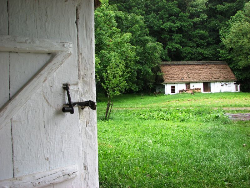 Zagroda jednobudynkowa ze wsi Nadolany z 1866 roku. Budynek o konstrukcji zrębowej. Dach półszczytowy kryty słomianą strzechą z gontową kalenicą. Zrąb bielony wapnem. Widok z chałupy z Dąbrówki z 1681 roku – na pierwszym planie drzwi do części gospodarczej budynku.