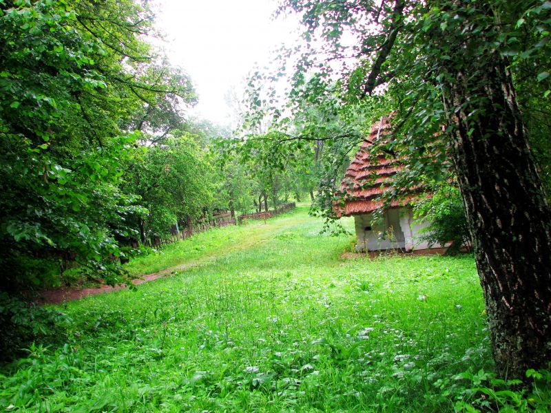 Widok na sektor Parku Etnograficznego poświęcony Pogórzanom Wschodnim. Wśród zieleni chałupa z Niebocka (pow. brzozowski) z 1801 roku. Budynek z drewna wiąznanego w węgłach „na obłap”. Dach czterospadowy o poszyciu ze słomy z kalenicą wzmocnioną koźliną. Chałupa pobielona wapnem.