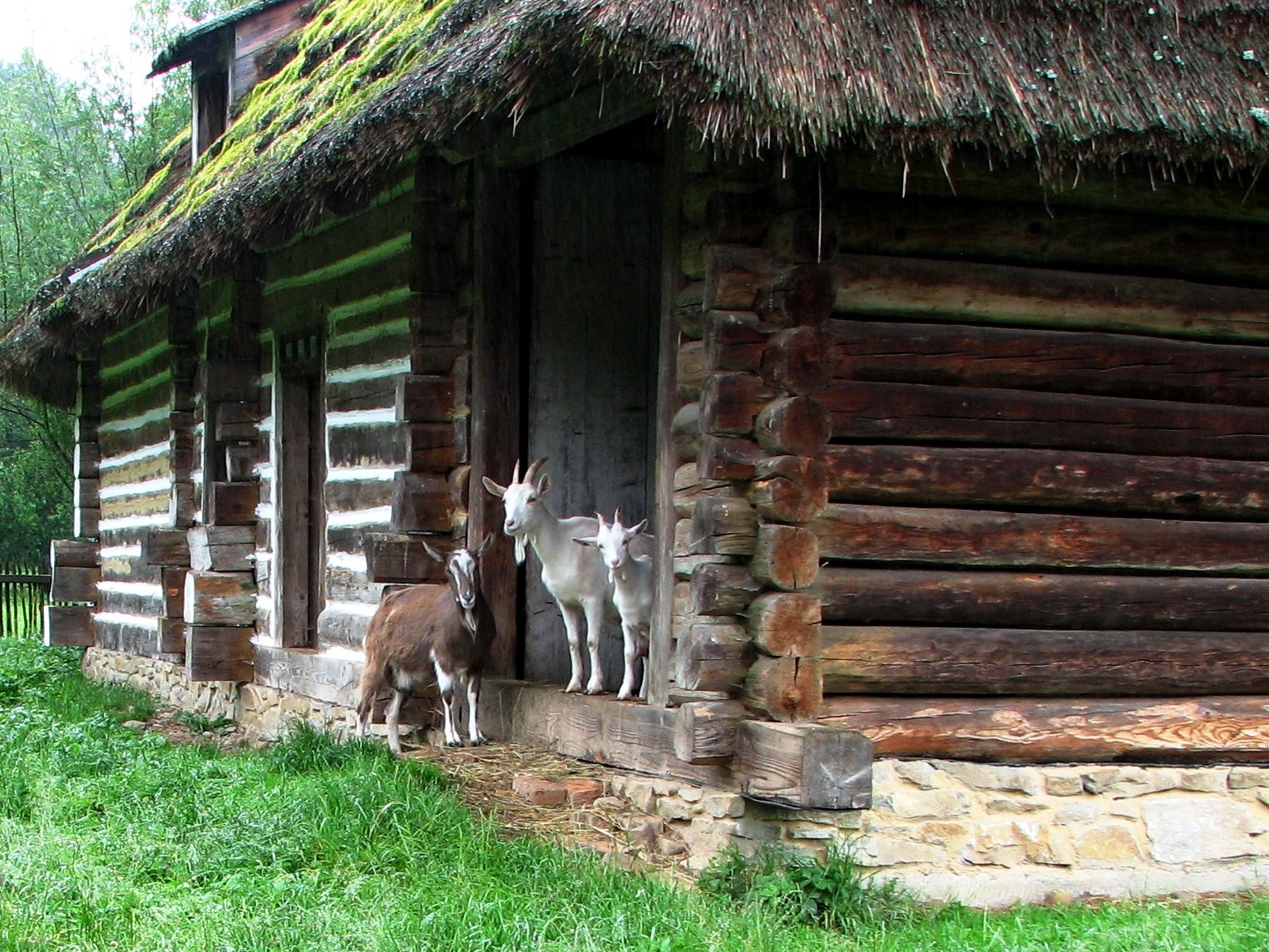 Kozy w części inwentarskiej chałupy ze wsi Blizne z ok. 1890 roku. Budynek o konstrukcji zrębowej z belek jodłowych łączonych na węgłach „na obłap”.