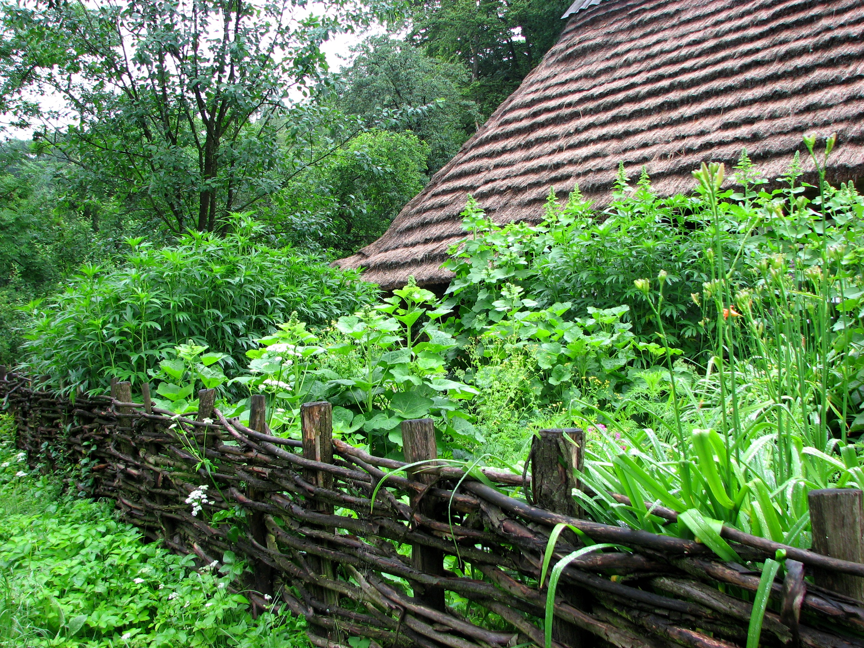 Płot koszowy pleciony z witek wierzbowych otaczający zagrodę jednobudynkową z Węglówki (pow. krośnieński) z 1892 roku. Budynek z półbali jodłowych wiązanych w węgłach „na obłap”. Dach czterospadowy o poszyciu ze słomy z rzędem dranic w kalenicy. Zrąb malowany na czarno sadzą z domieszka ropy naftowej, łączenia belek pobielone wapnem. |