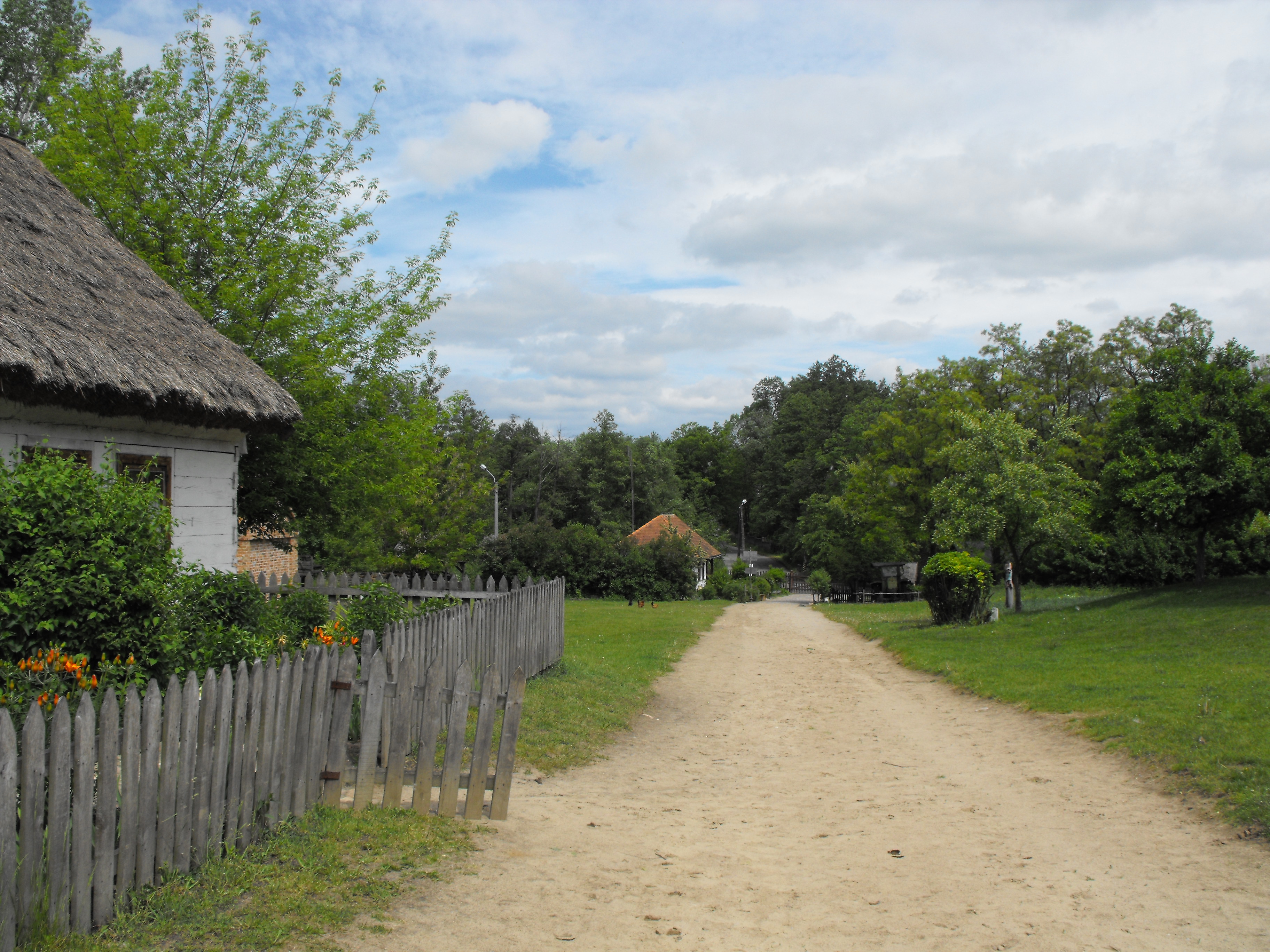 Teren skansenu. Po lewej stronie chałupa o konstrukcji zrębowej z dachem dwuspadowym krytym strzechą.