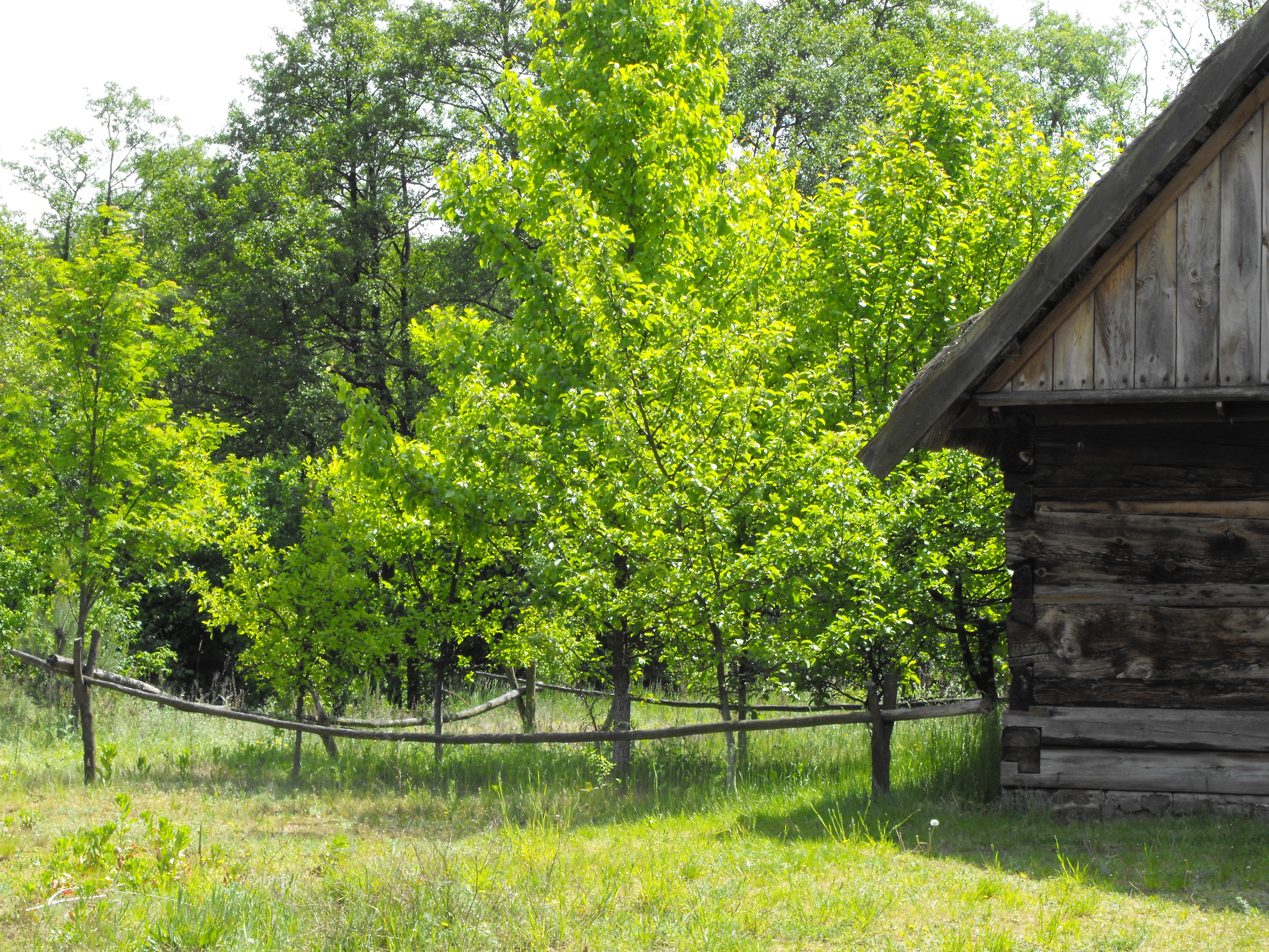 Obszar leśny przy chałupie dobrzyńskiej. Chałupa o konstrukcji zrębowej z dachem dwuspadowym.