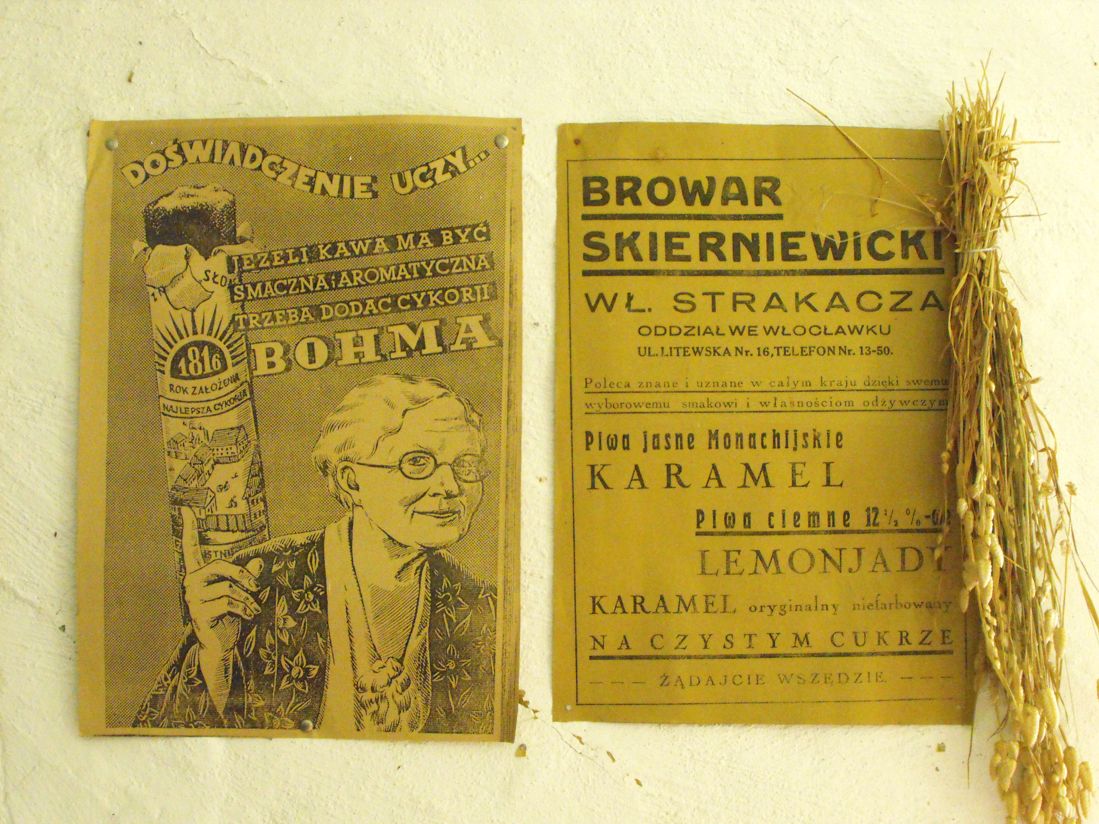 Wnętrze karczmy ze wsi Pułkowo Wielkie. Powiększone ulotki z poradami i „reklamówki”, wiszą na ścianie w karczmie np. „Doświadczenie uczy... jeżeli kawa ma być smaczna i aromatyczna trzeba dodać cykorji BOHMA”.