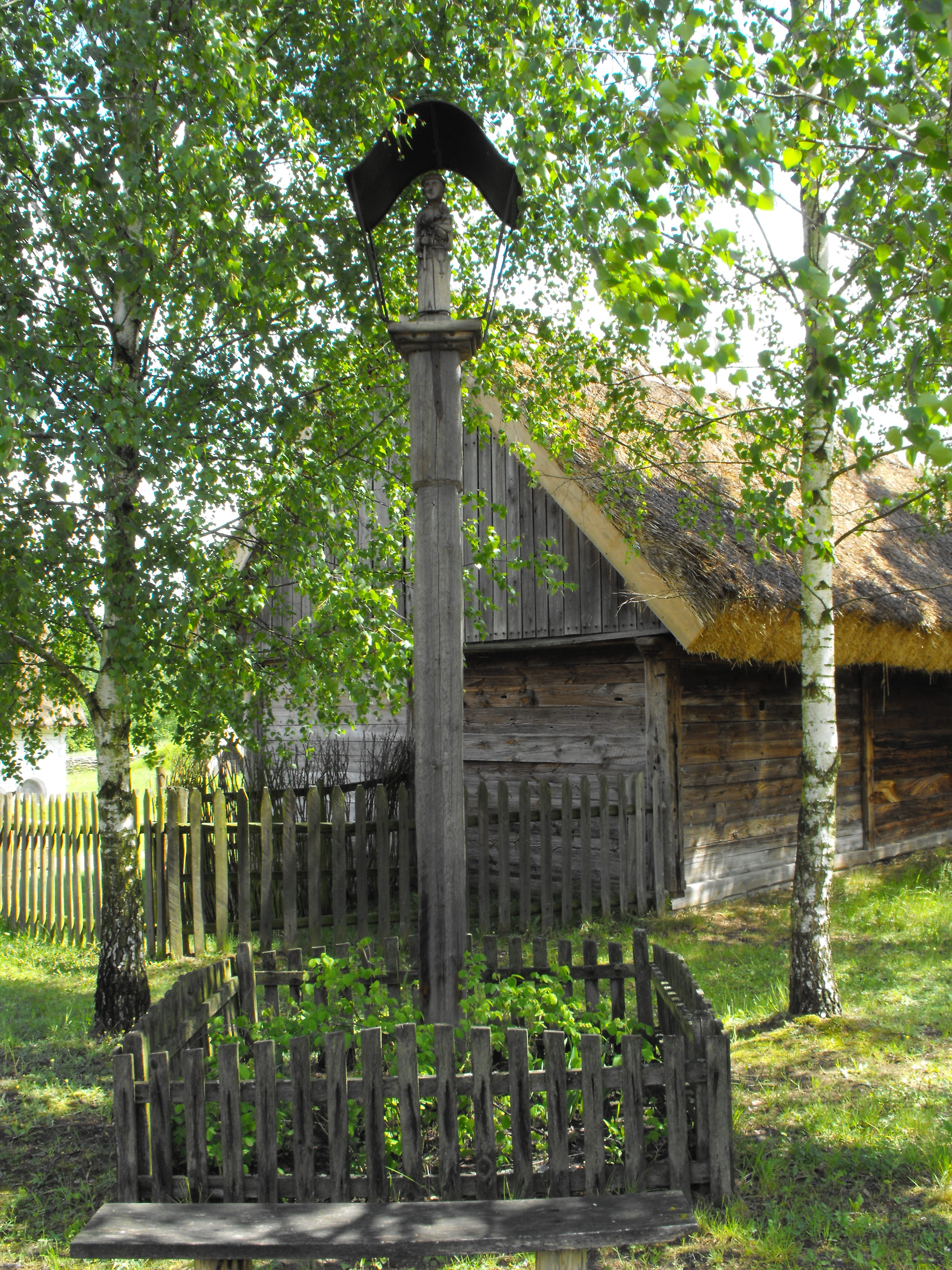 Drewniana, słupowa kapliczka przydrożna z figurką św. Antoniego. Św. Antoni to patron od kradzieży i zguby. W tle kujawski budynek inwentarski.