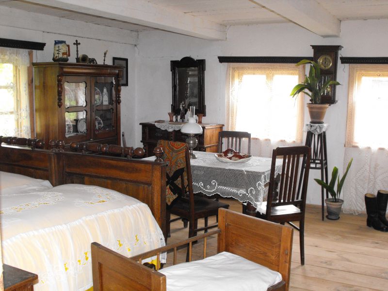 Izba młodych w chałupie kujawskiej ze wsi Zalesie koło Chodcza. Wyposażenie z lat 30. XX w.: dwa zdobione łóżka zsunięte ze sobą, nakryte haftowanymi, batystowymi kapami oraz oszklona serwantka, w której ustawiono porcelanowe i fajansowe talerze, misy, naczynia ze szkła, sztućce. Stół pośrodku izby, na nim niciany obrus i lampa naftowa. Okna zdobią niciane firanki. |