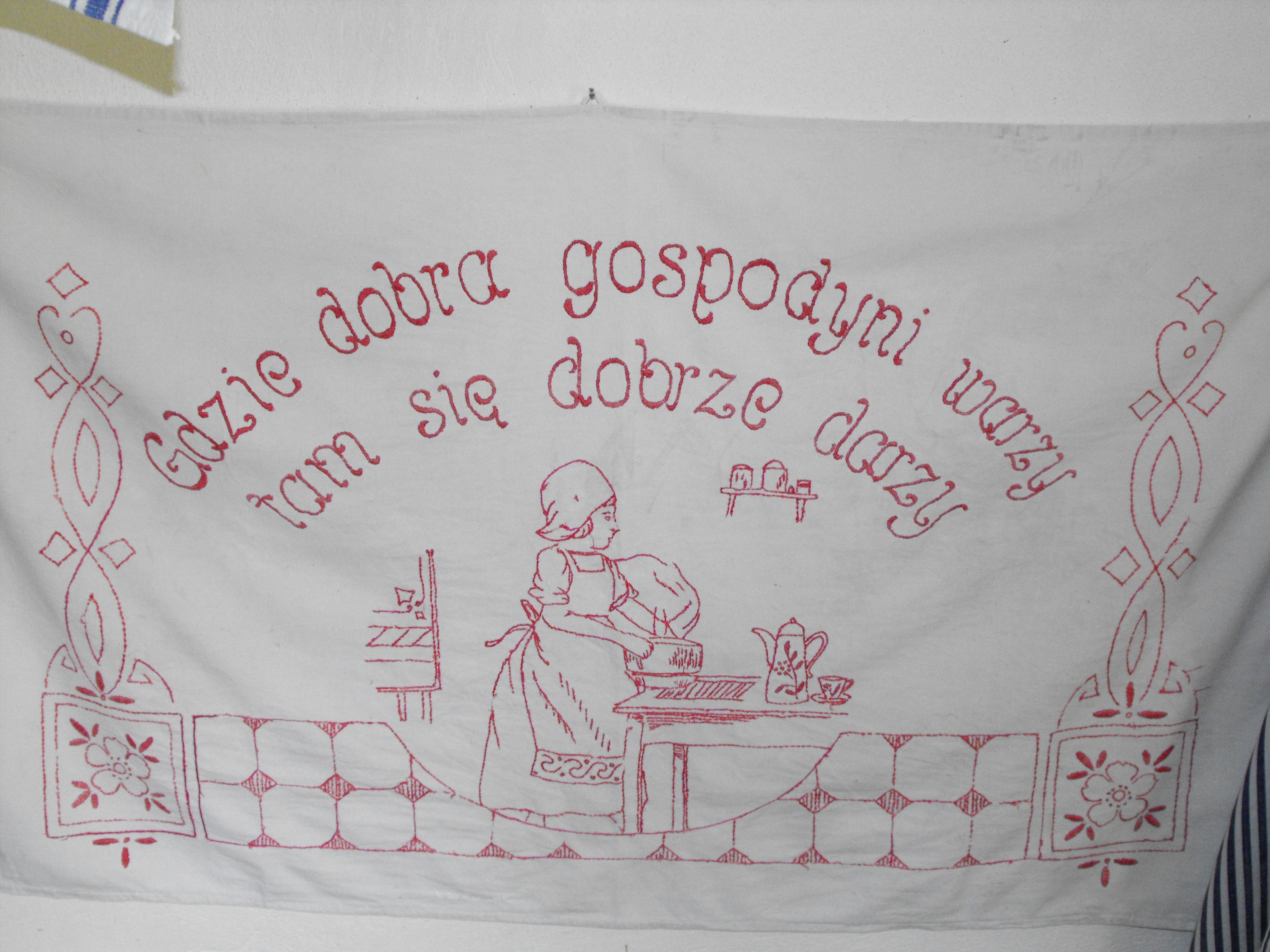 Wnętrze chałupy kujawskiej ze wsi Zalesie koło Chodcza. Wyszywana makatka w kuchni: „Gdzie dobra gospodyni warzy, tam się dobrze darzy”.