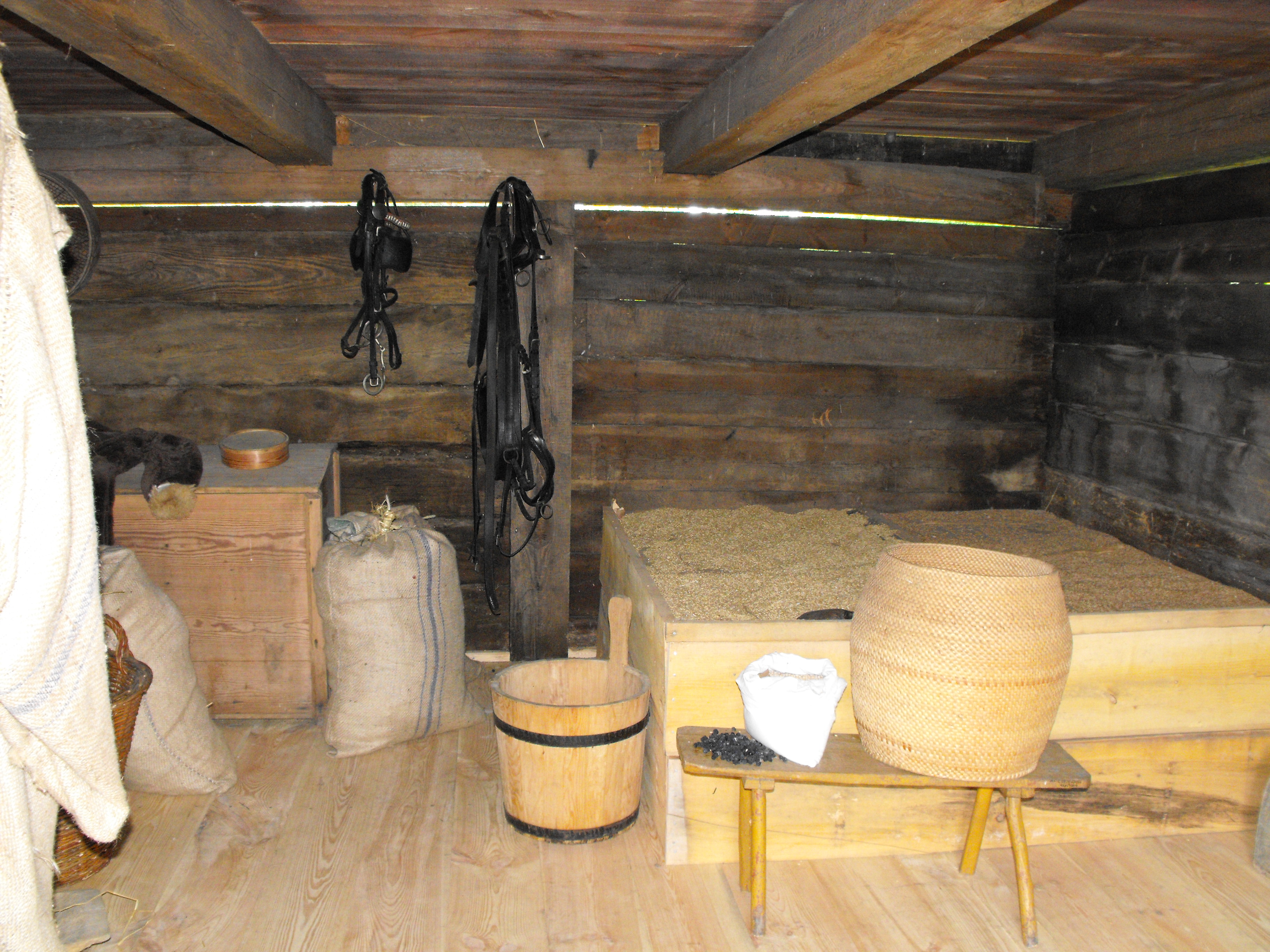 Wnętrze spichlerza kujawskiego z wsi Zalesie, a w nim worki i kosze ze zbożem.