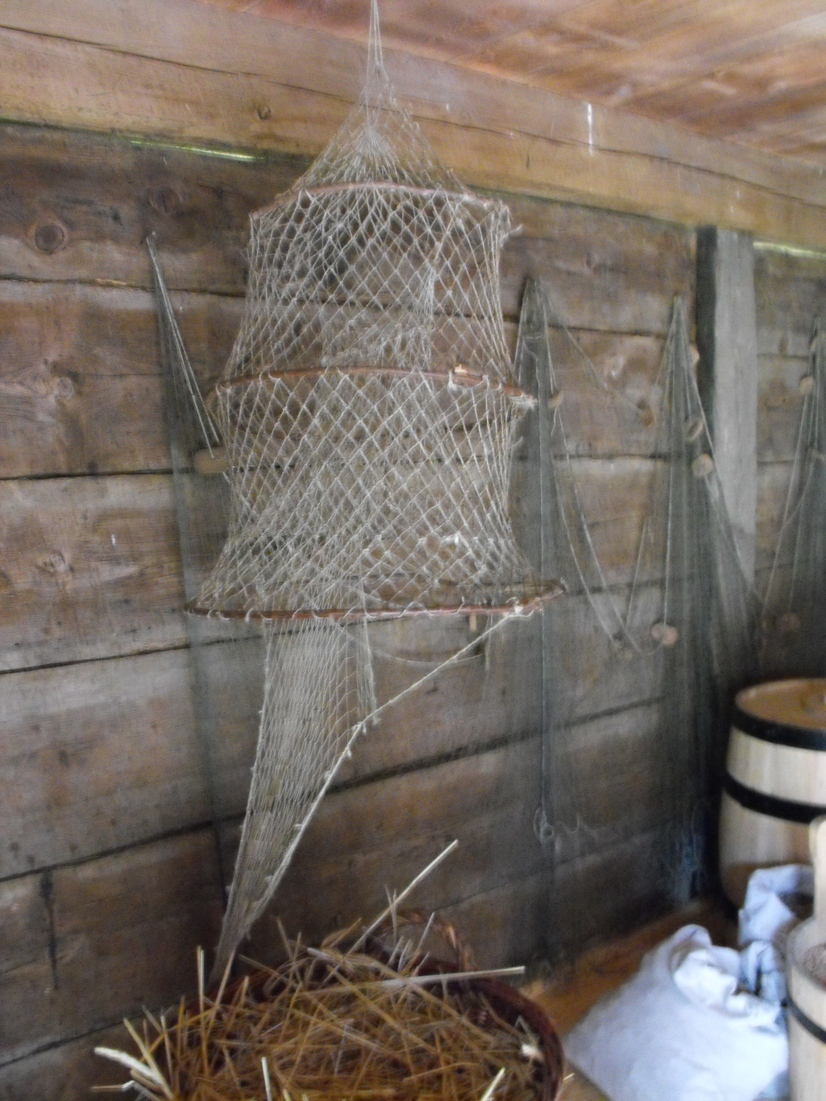 Wnętrze spichlerza w budynku gospodarczym z wsi Zalesie. Widoczna sieć kłusownicza na ryby.