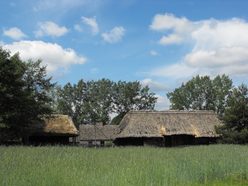 Zagroda kujawska wykonana na przełomie XIX/XX w. należała do najzamożniejszych mieszkańców wsi kujawskiej. Widoczna na zdjęciu chałupa, stodoła, spichlerz oraz budynek inwentarski. Obiekty ustawione są na planie czworoboku. Wszystkie dachy w zagrodzie są kryte strzechą.