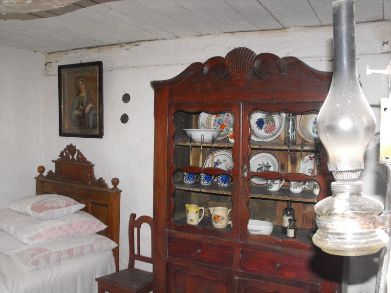 Wnętrze alkierza w chałupie kujawskiej. Kredens z oszkloną górą, zdobione łóżko, obrazy, lampa naftowa, porcelanowe i fajansowe naczynia.